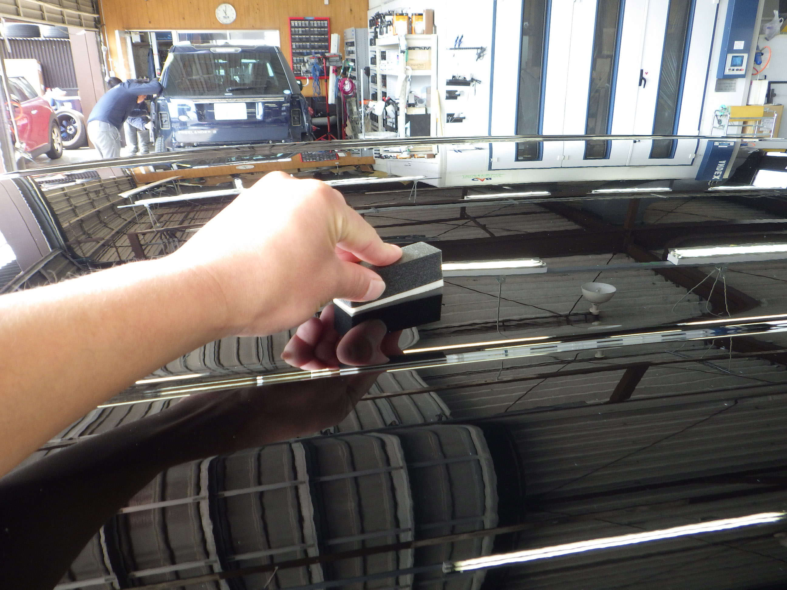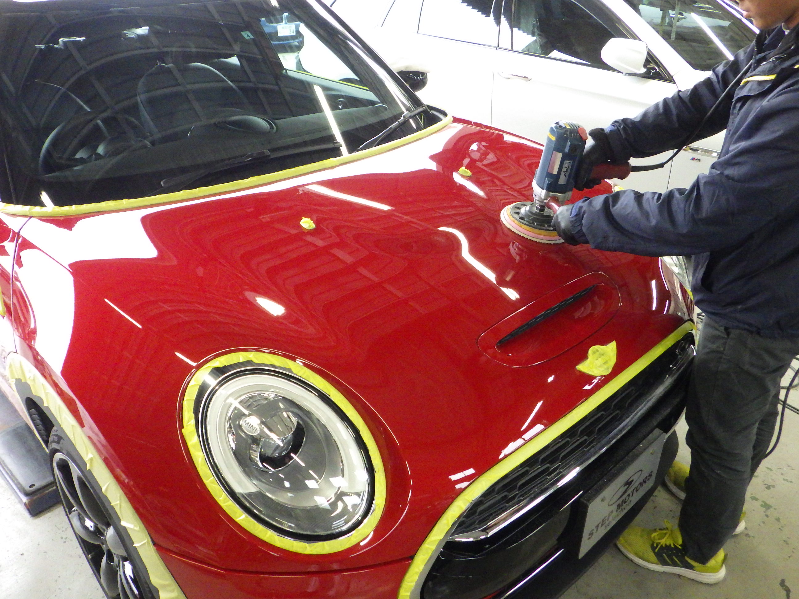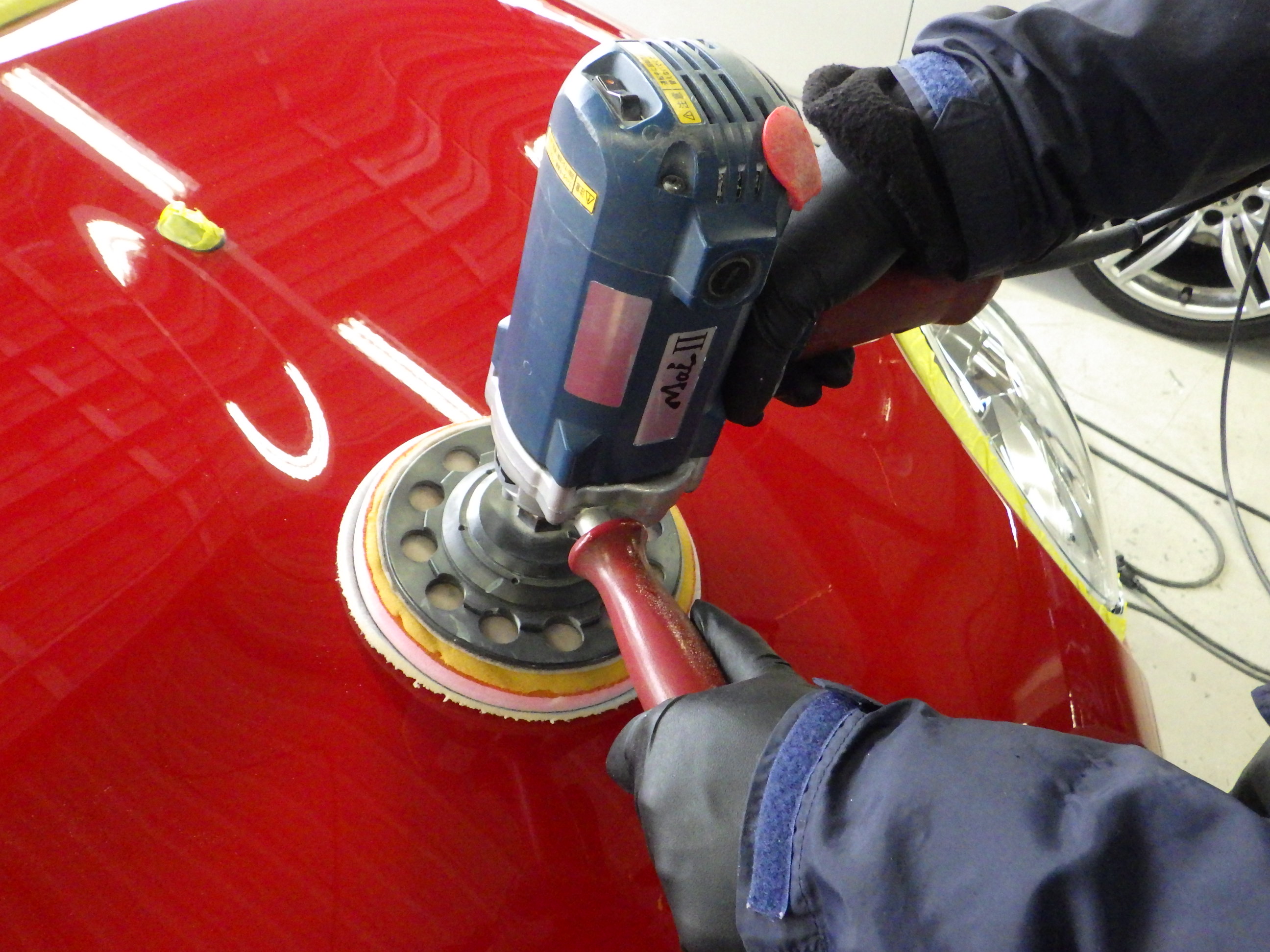 マスキング作業の後、ポリッシャーを使用し磨き作業を行いました。