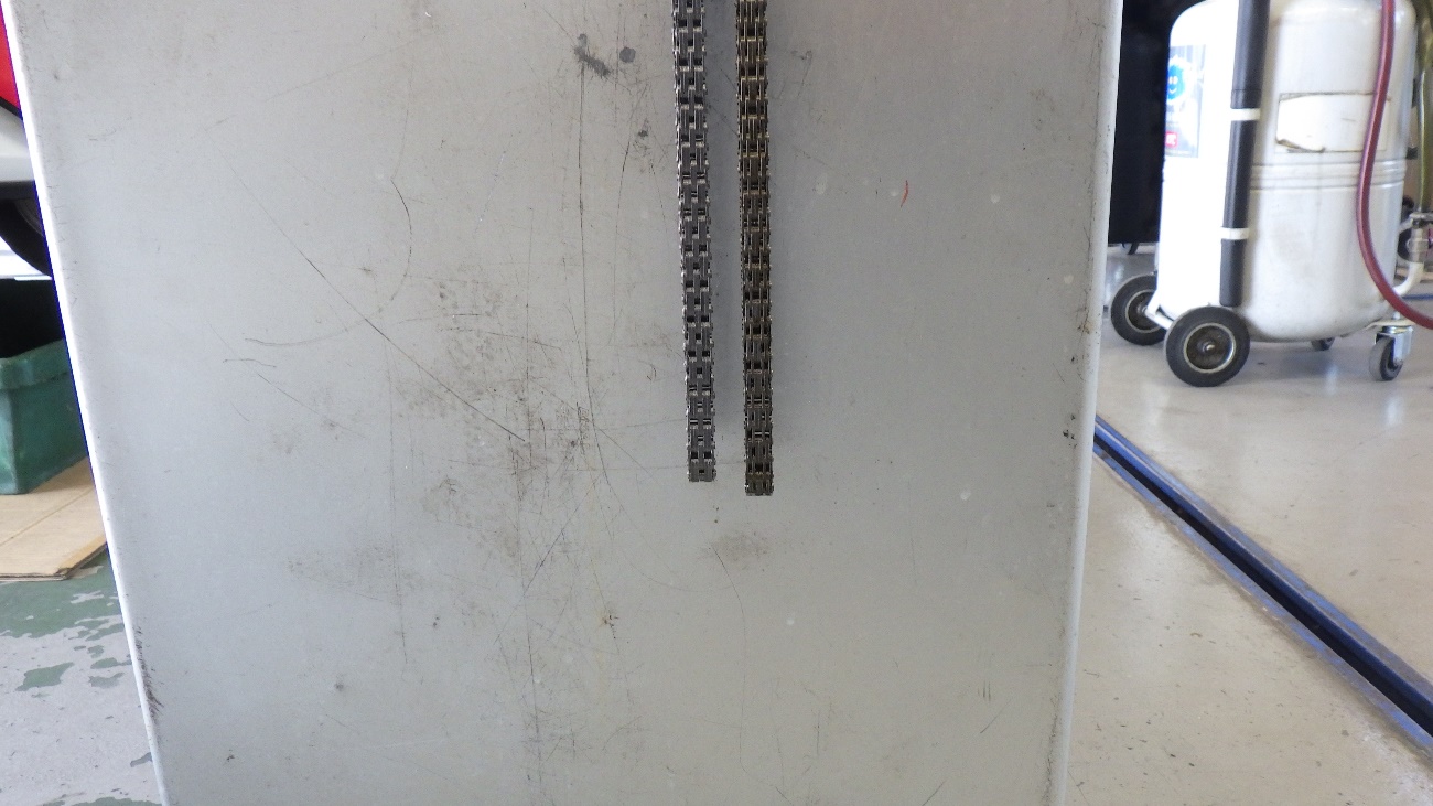 新旧のオイルポンプのチェーンを比較した写真です。