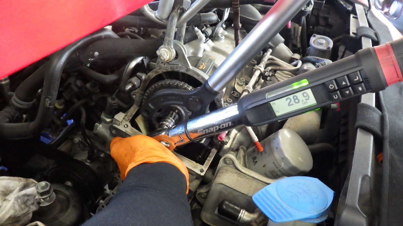 カムシャフトギアのボルトを規定トルクで締め付けております。