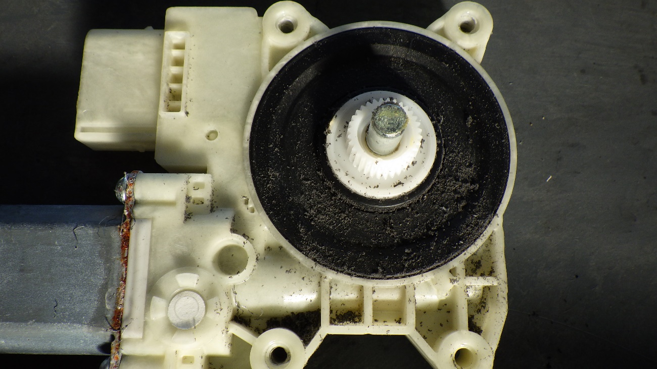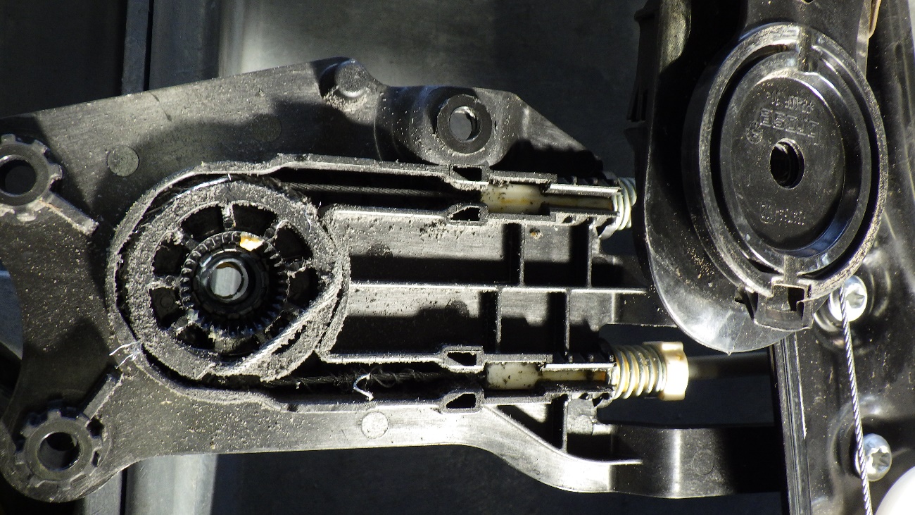 パワーウィンドウモーターを取り外して確認したところ、パワーウィンドのワイヤーがガイドレールから外れてワイヤーが切断寸前でした。