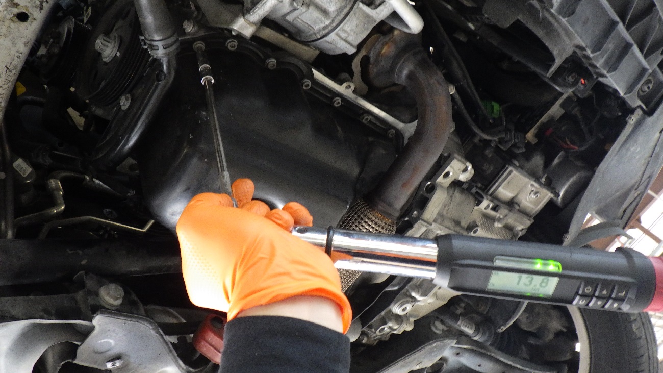 エンジンオイルパンを再シーリング後、締め付けを規定トルクで締め付けております。