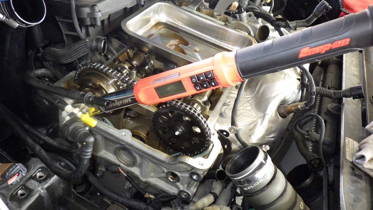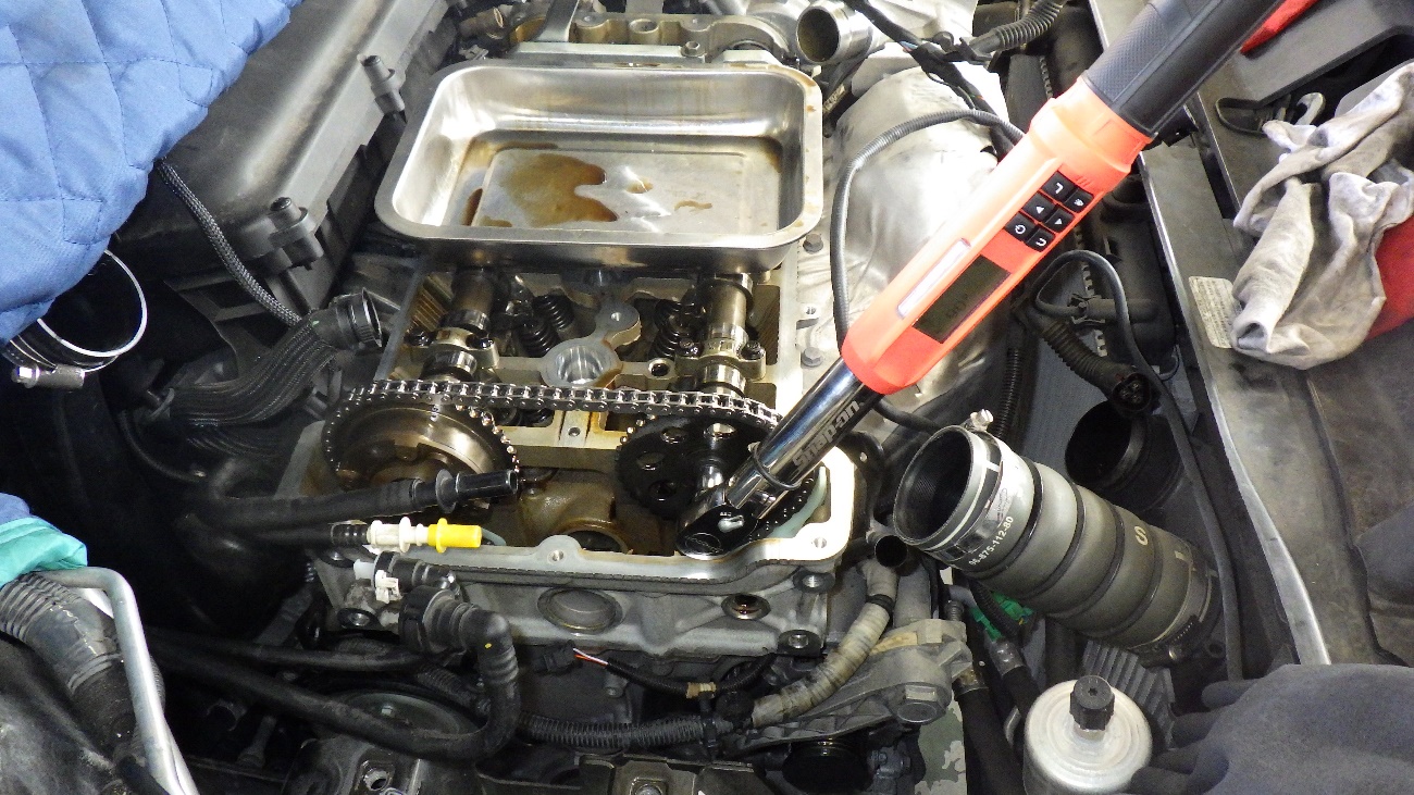 タイミングチェーン組付け後、チェーンテンショナーの締め付けを規定トルクで締め付けております。