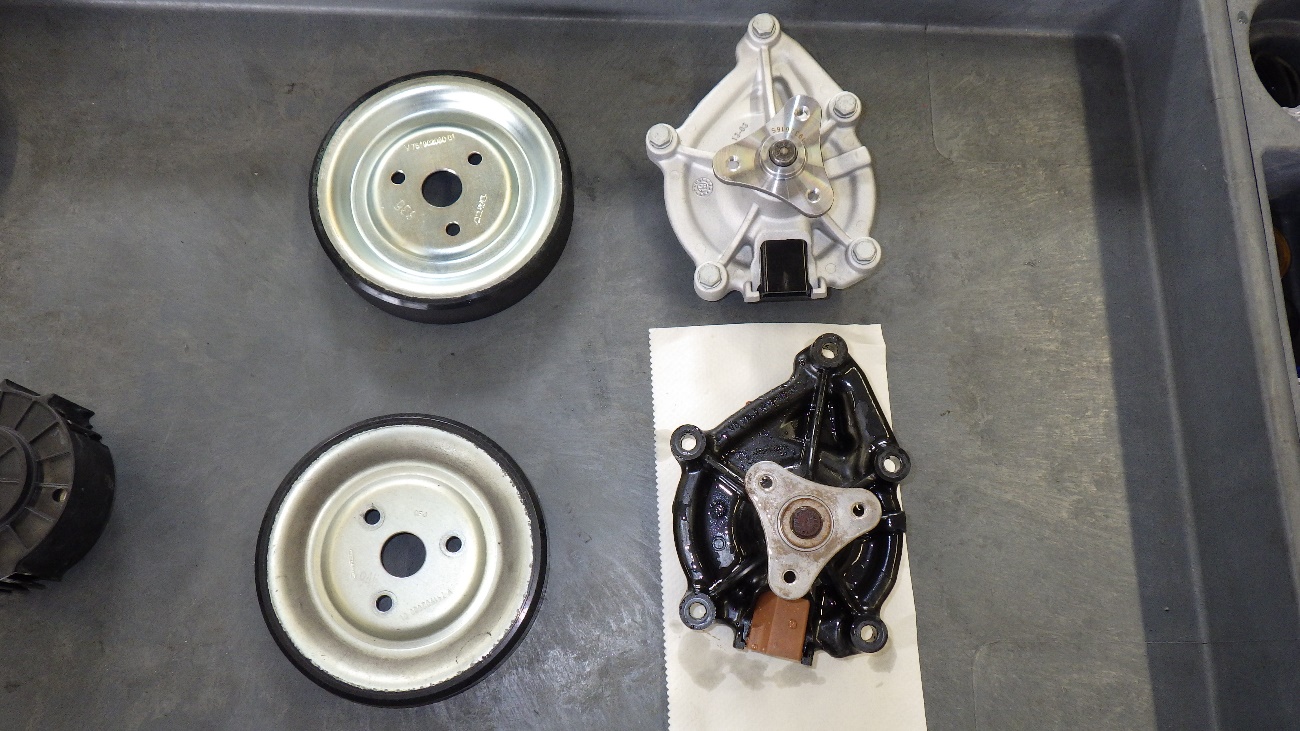 下が取り外したウォーターポンプで、上の部品が新しいウォーターポンプになります。