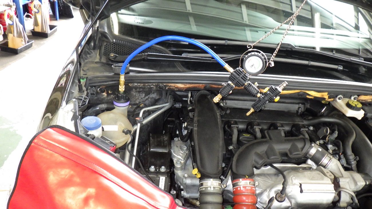 ウォーターポンプの組付け作業が完了後、LLCの真空引きを実施。