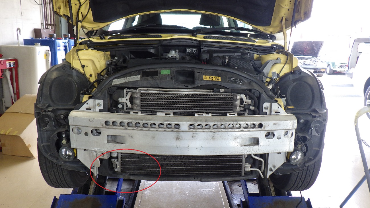 フロントバンパーを取り外した状態になります。赤丸枠内の左下付近よりLLCが漏れて