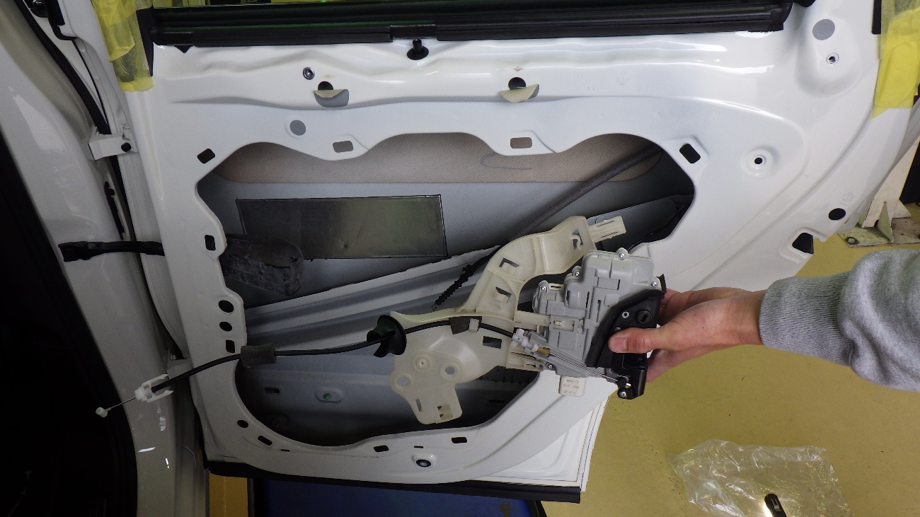 右リヤドアロックアクチュエーターASSYを交換している様子になります。