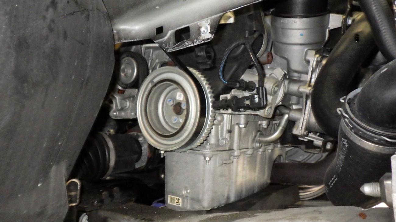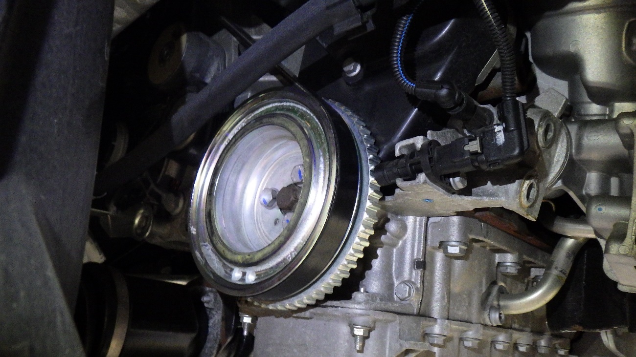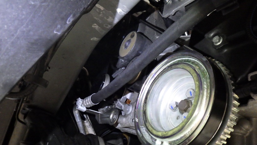 エアコンパイプの交換作業と同時にクランクプーリーの交換作業も進めました。
