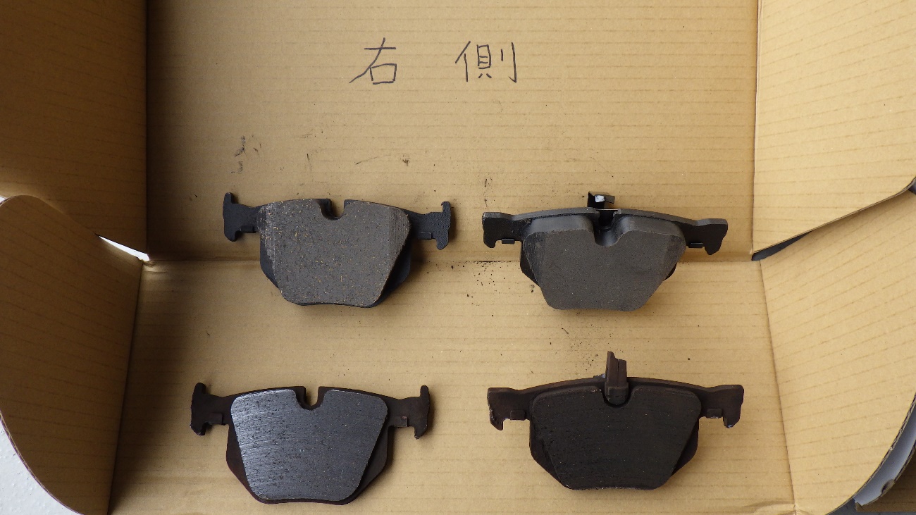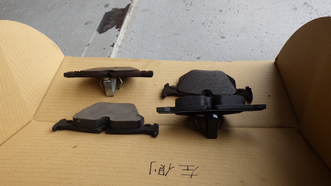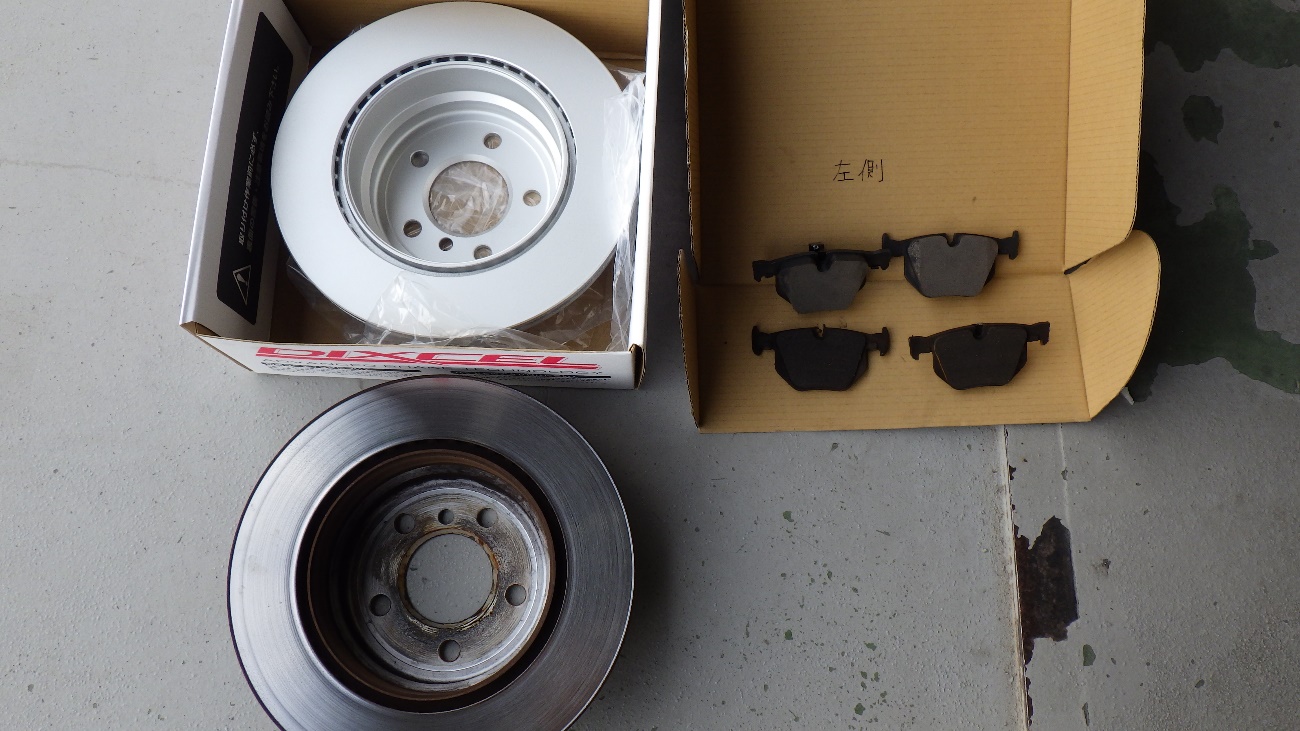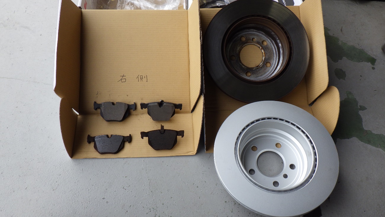 右側のブレーキパッド、ディスクローターを取り外した状態と、新しい部品になります。