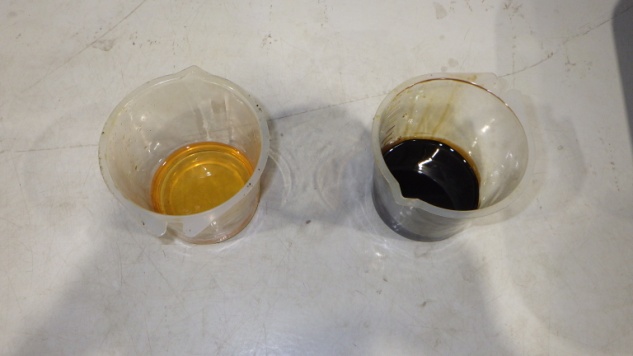 交換前、交換後のエンジンオイルです。オイル量の点検も実施しています。