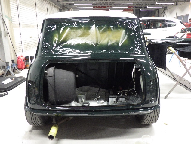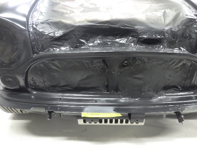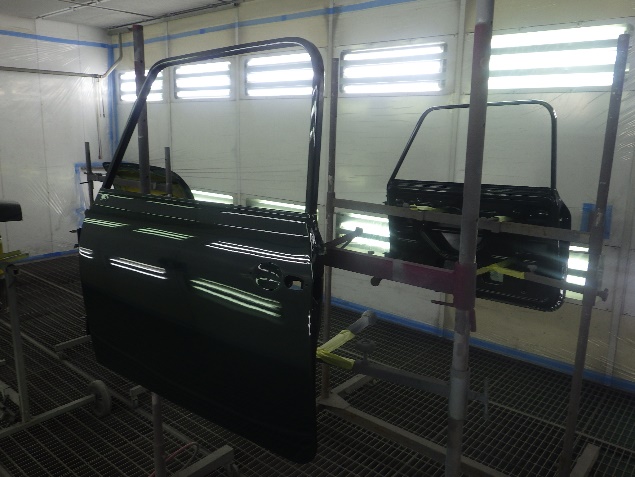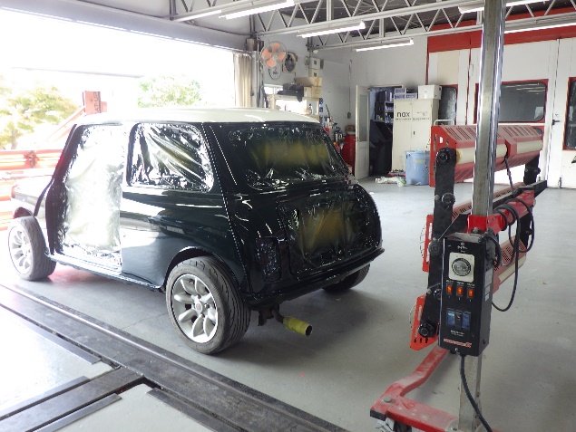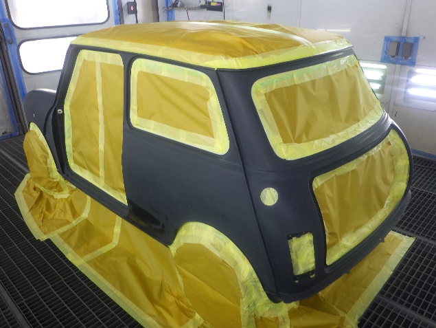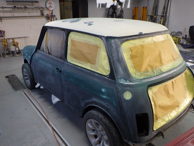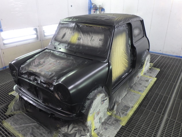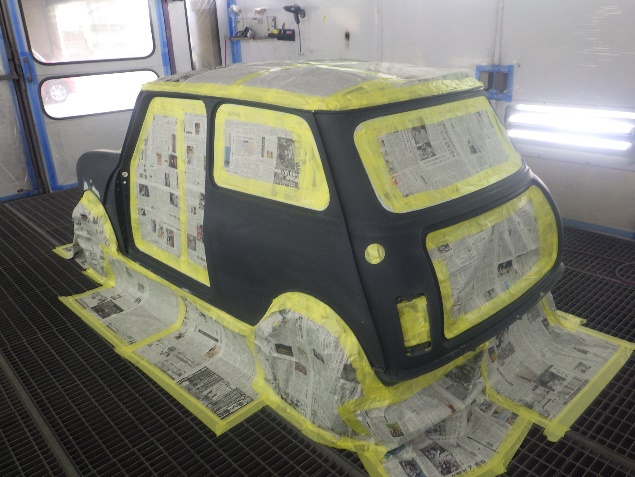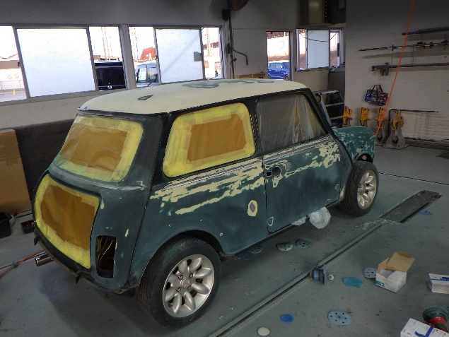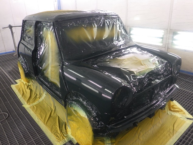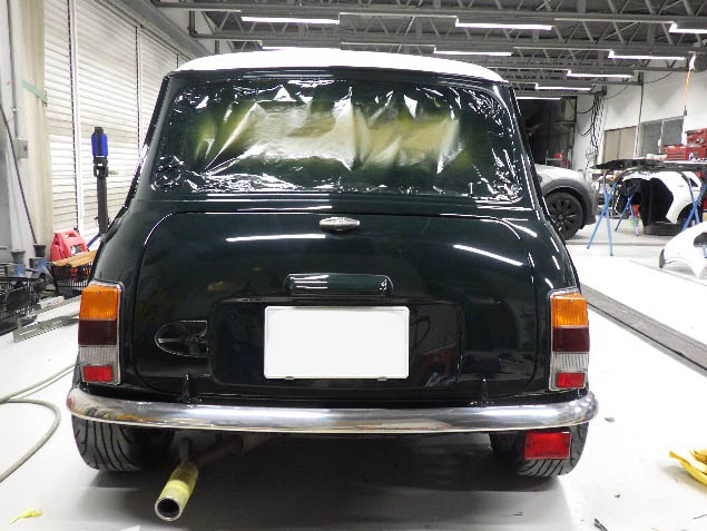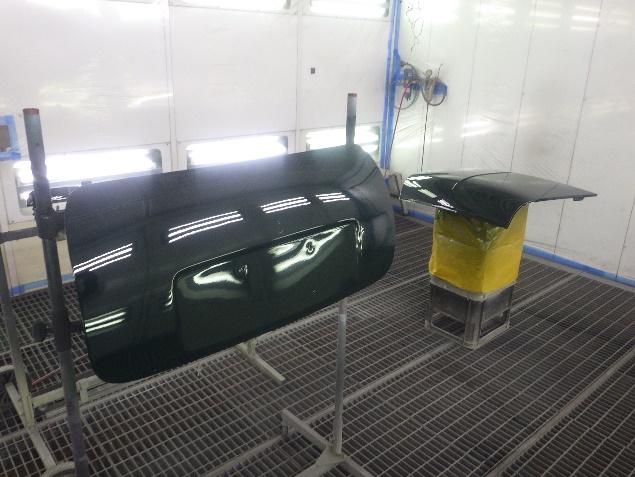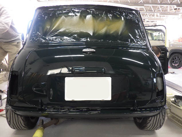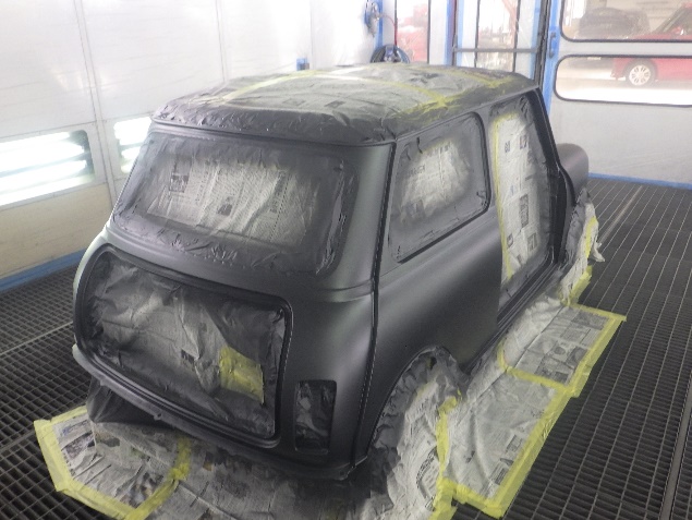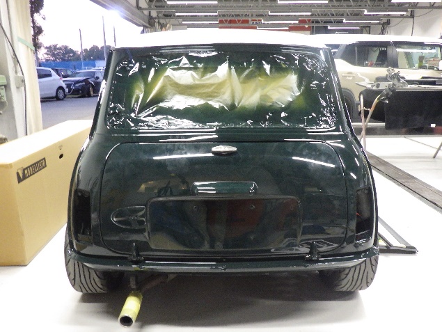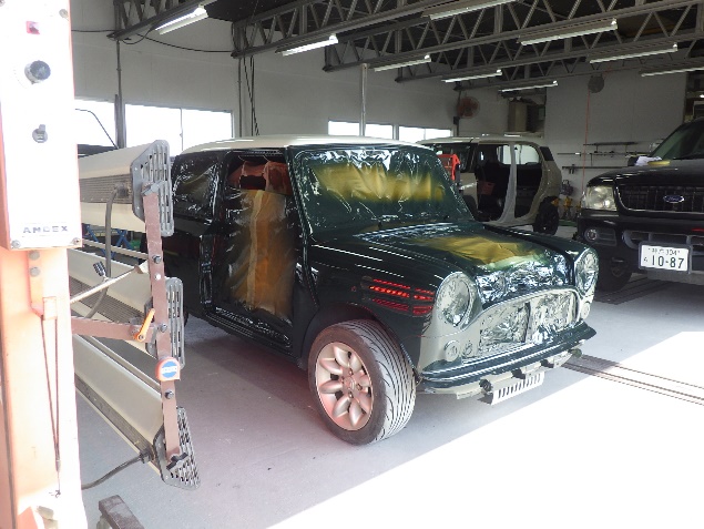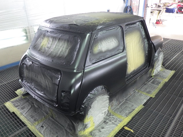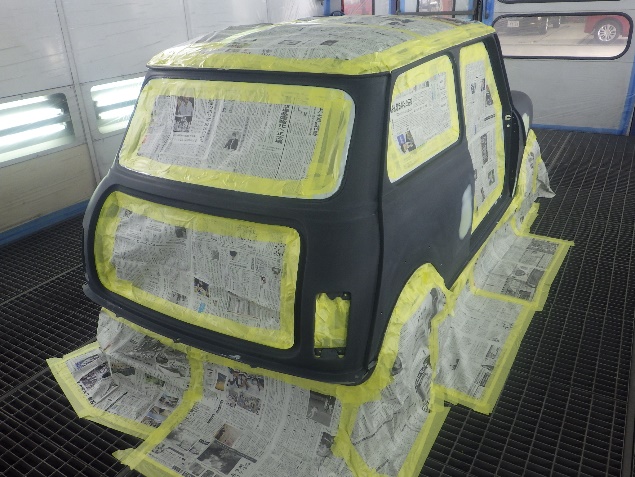 乾燥後、ボンネット、バックドア、左右ドアパネルから順に、塗装準備を行い、
