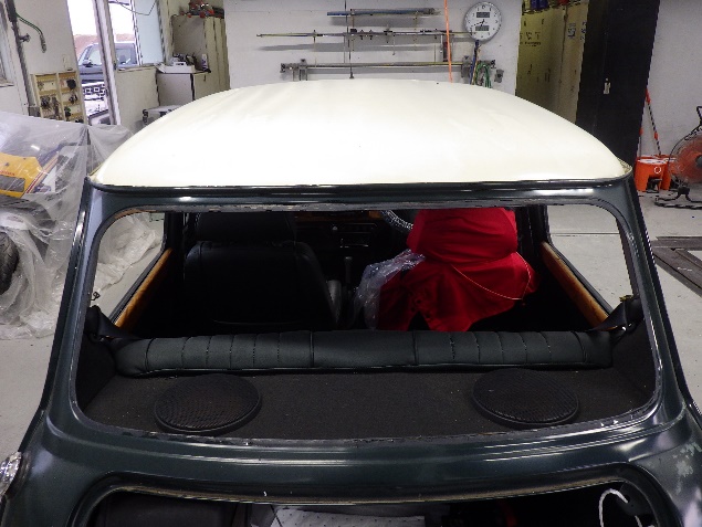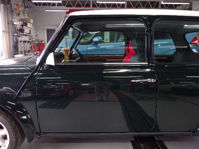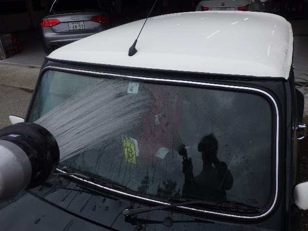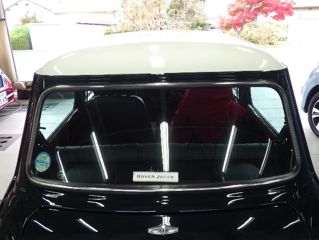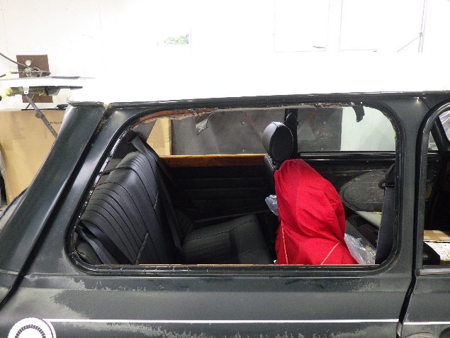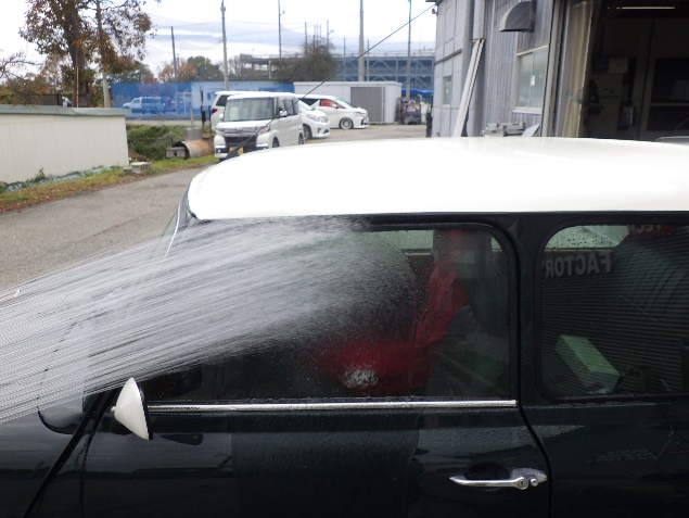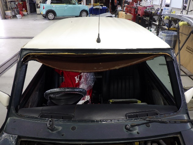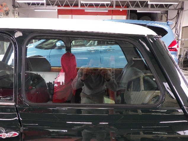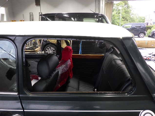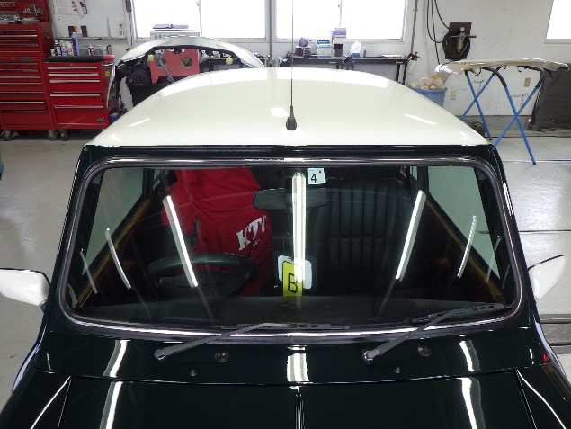 磨き作業の後、フロントガラス、リヤガラス、左右クォーターガラスの取り付け作業、