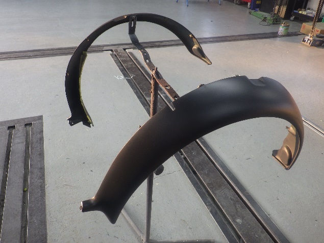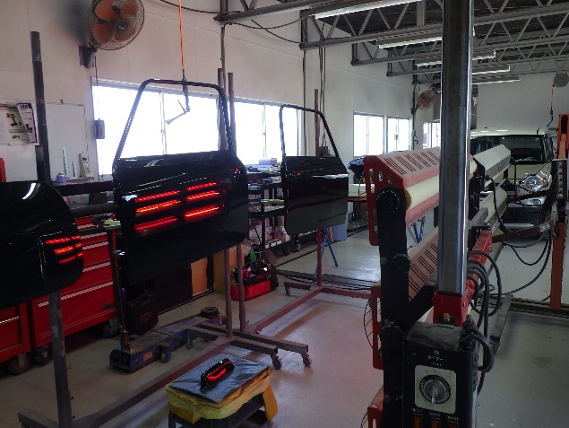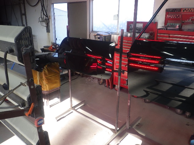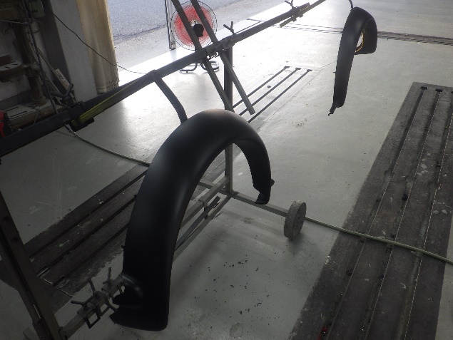 板金作業の後、左右フロント、リヤのオーバーフェンダー、バックドアガーニッシュの修正を行い、