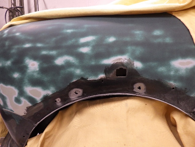 左フロントフェンダー、ドア修正での入庫になります。 修正作業を行う為、分解作業を行いました。 分解作業の後、塗膜の剝離作業を行いました。 剝離作業の後、穴…