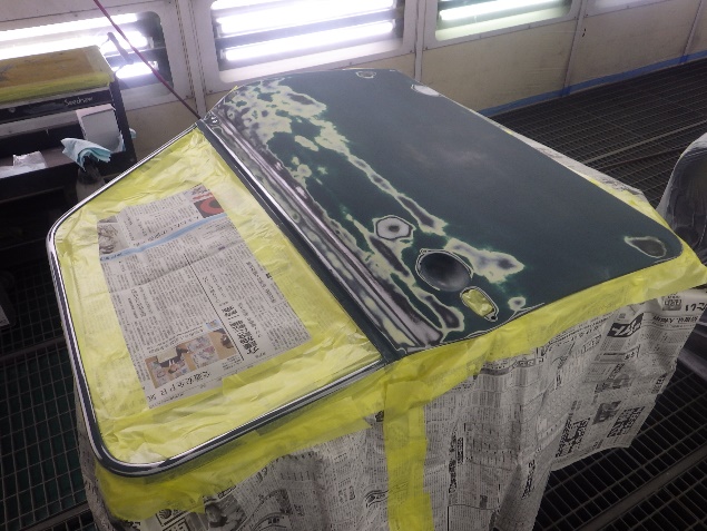 パテ付け作業の後、ルーフパネルの旧塗膜が密着不良になっていたので、全面剥離作業を行いました。