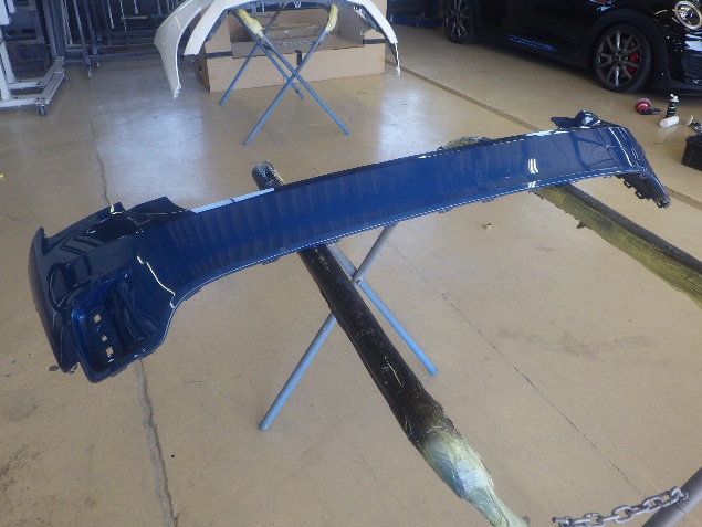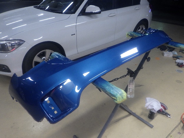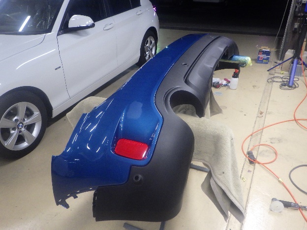 部品の取り外し作業の後、リヤバンパーのキズ修正作業を行いました。