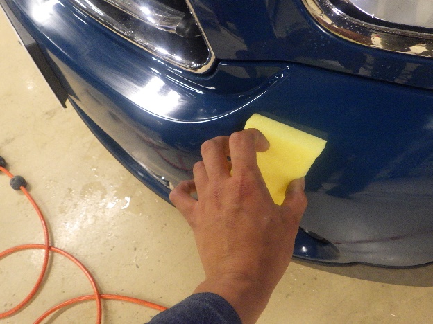サフェーサー乾燥の後、足付け作業、脱脂作業、エアブローを行い、