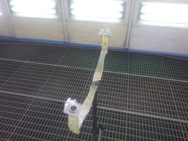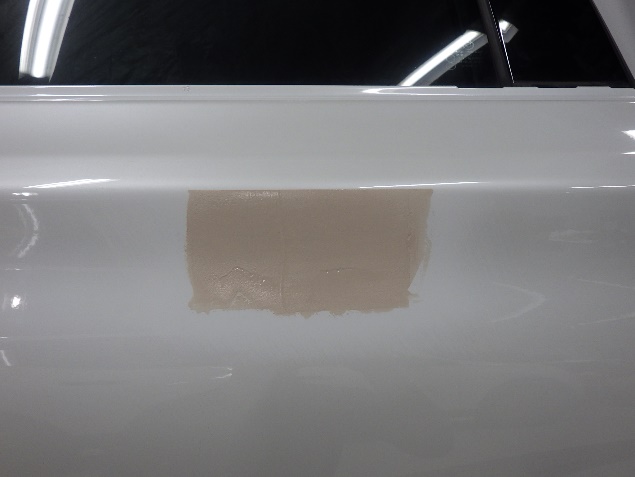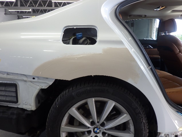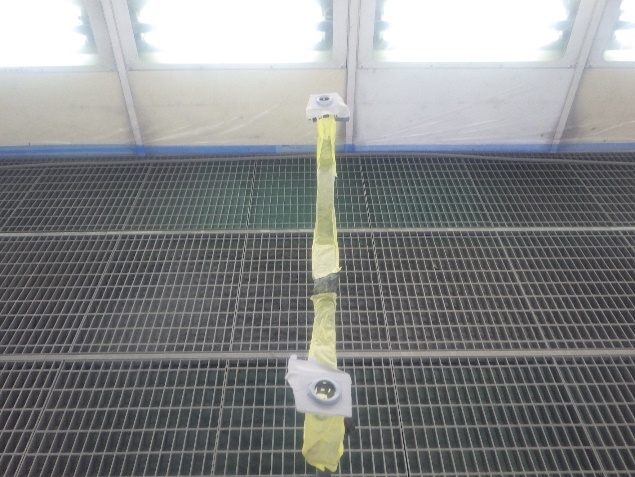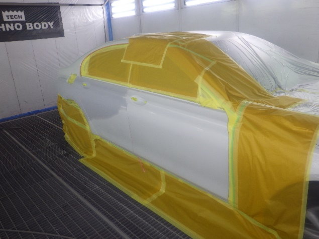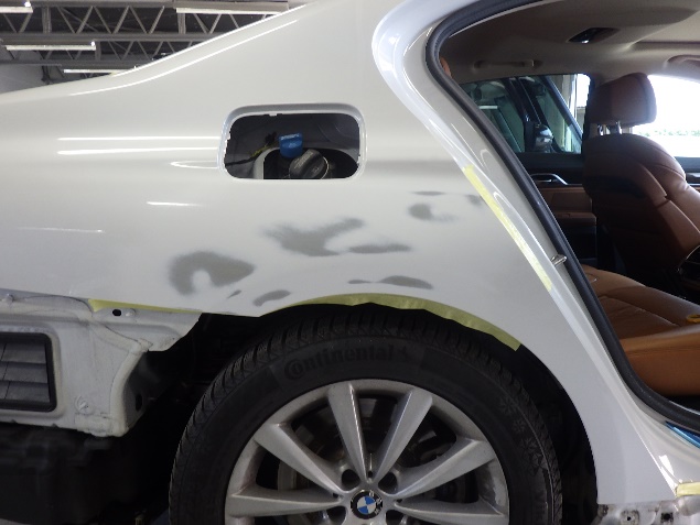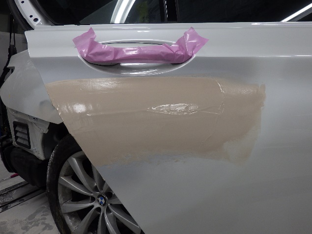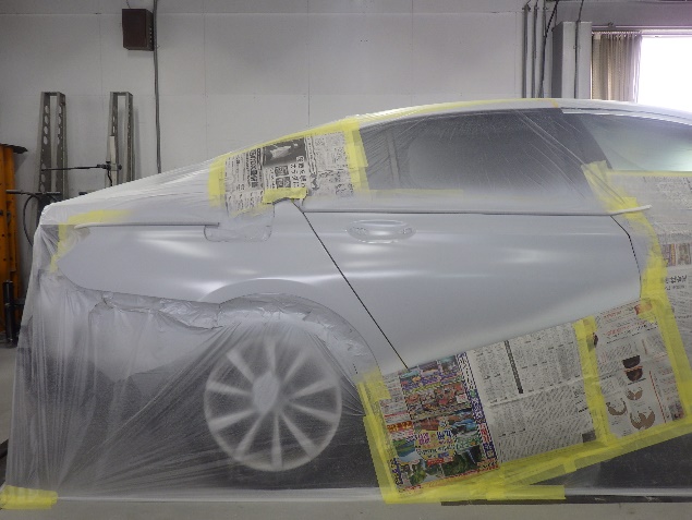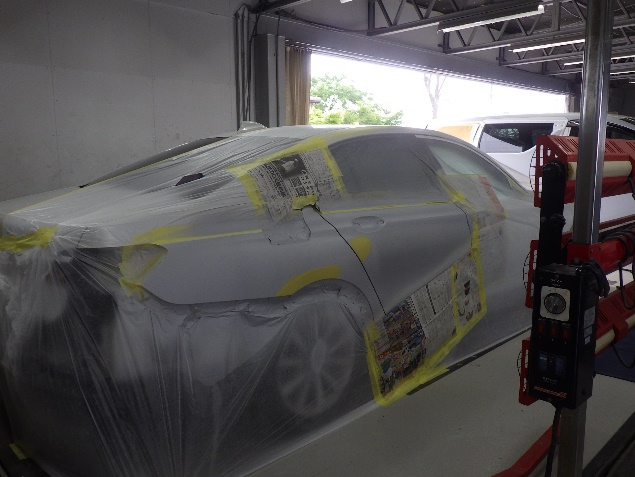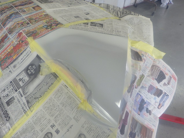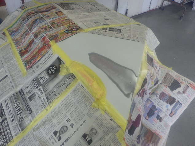 鈑金修正作業の後、足付け、紙張り、脱脂、エアブローを行い、プライマー、