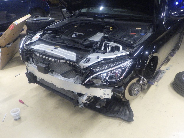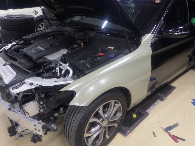 フロント足廻り損傷でのお預かりになります。 入庫後、入庫確認作業を行い、キズ、汚れ防止の為、ハンドルカバー、 シートカバーの取り付けを行いました。 入庫確認の後…