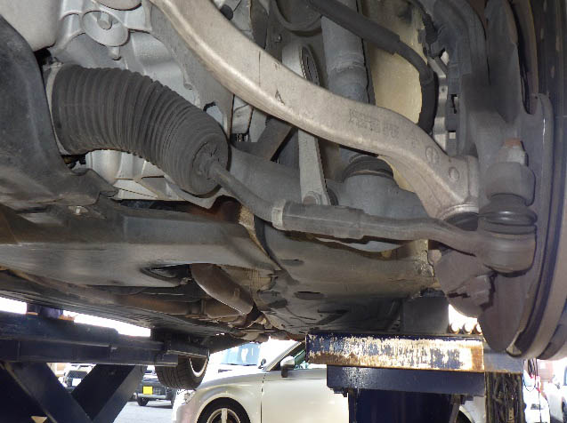 足廻り計測作業の後、車体のリフトアップを行い、底廻りの損傷確認、
