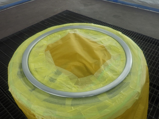 足回り部品交換の後、ホイールの傷修正を行い、塗装準備(足付け、マスキング、脱脂、