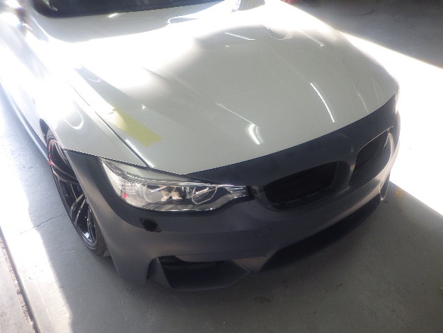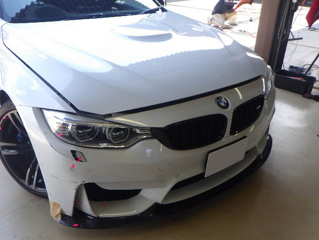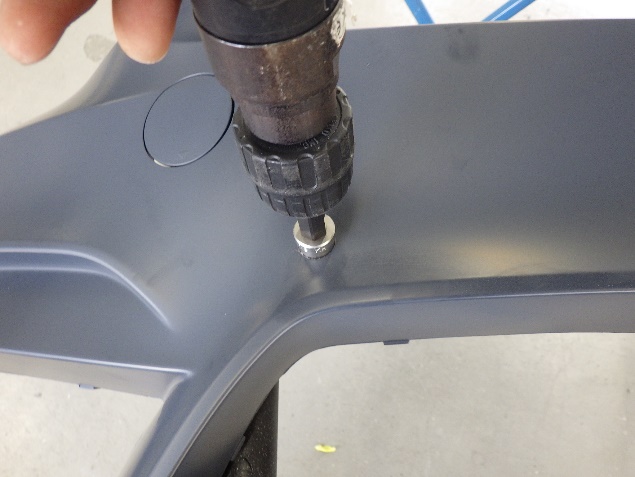 仮合わせ作業の後、フロントバンパーへソナーを取り付ける、穴開け作業を行いました。
