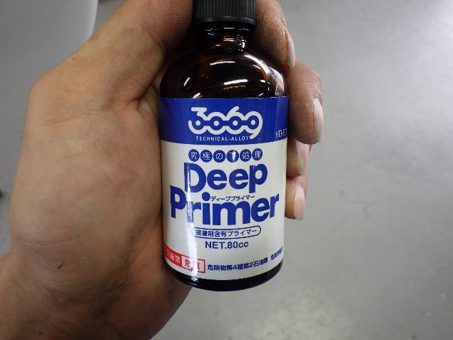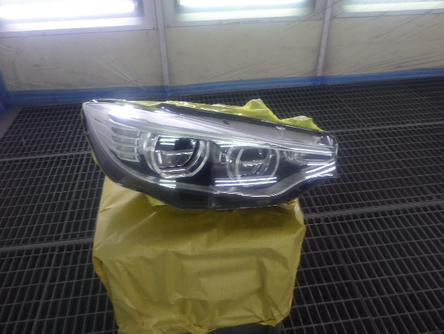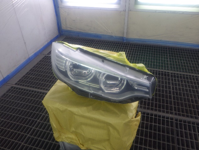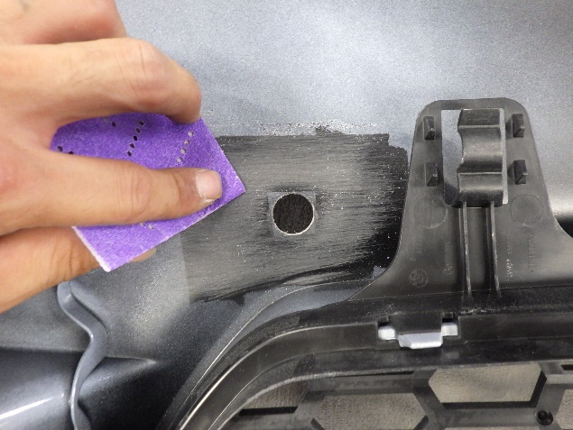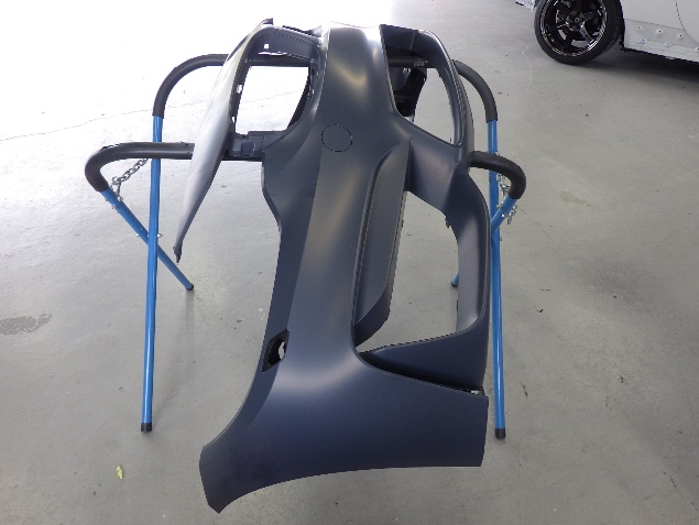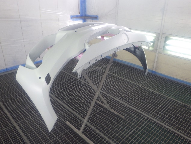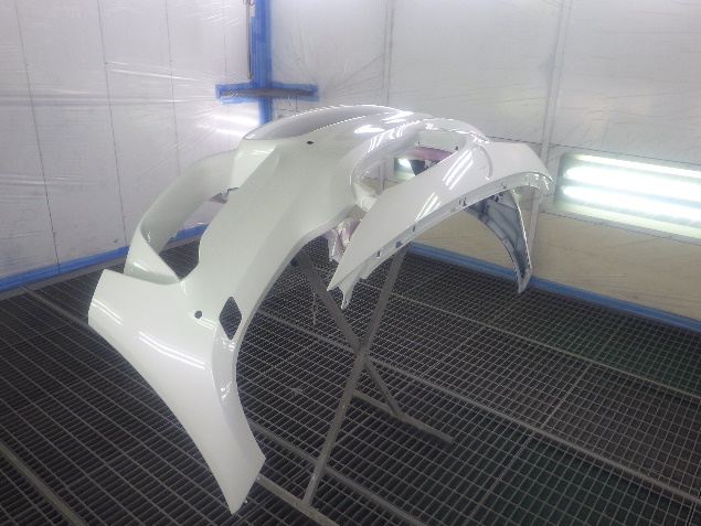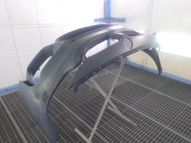 新品のフロントバンパーに、塗膜の密着性を向上させる為に、プライマーの塗布作業を行いました。
