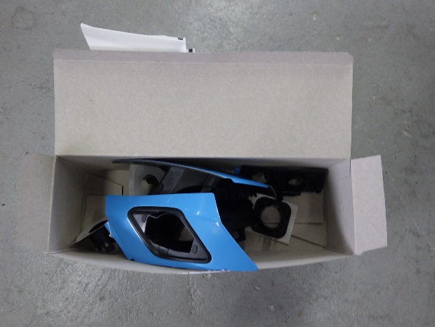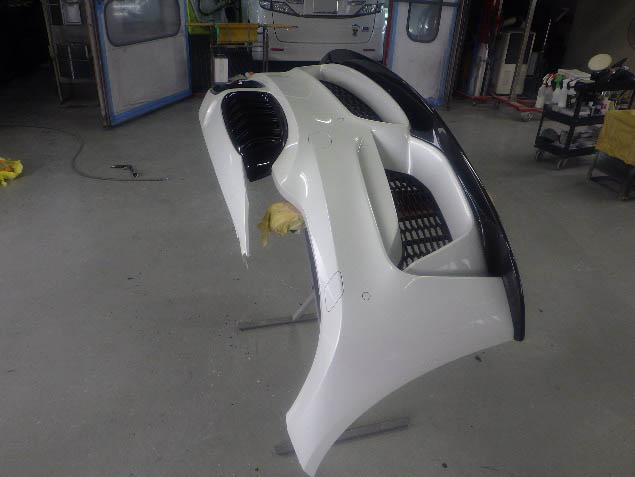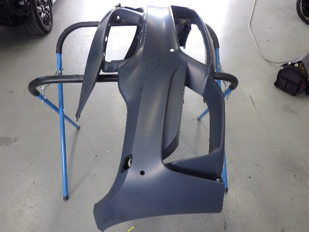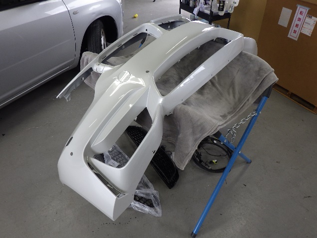 乾燥後、フロントバンパーに構成部品を取り付け、組み立て作業を行いました。
