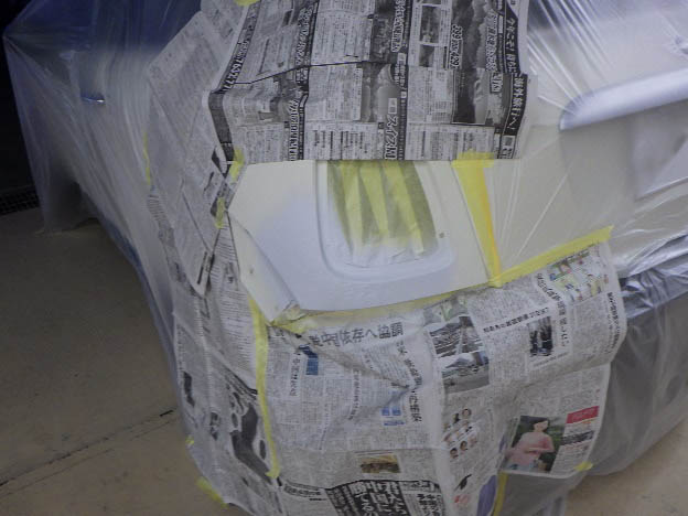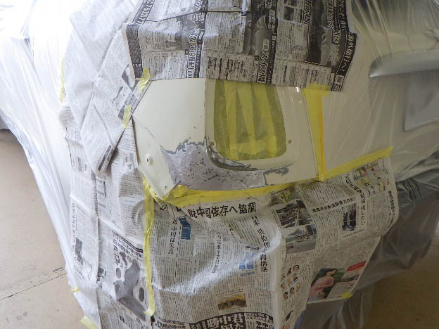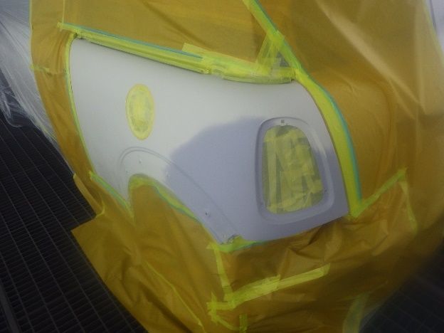 パテ乾燥の後、サンディング作業、マスキング作業、脱脂作業、エアブローを行い、