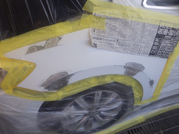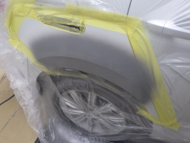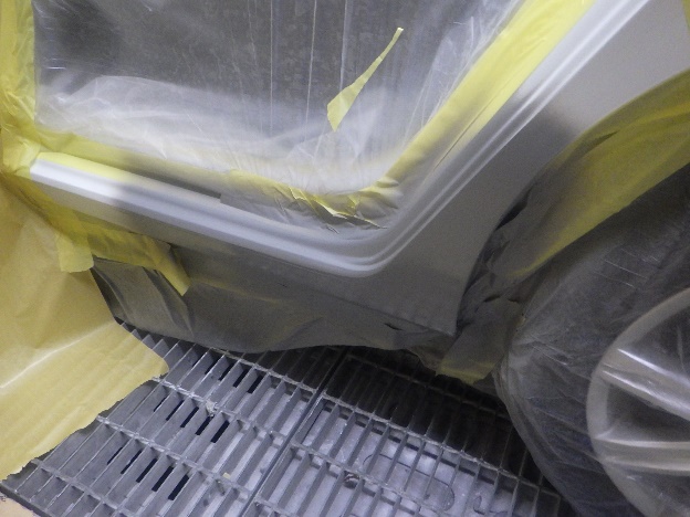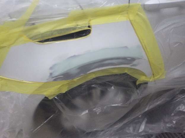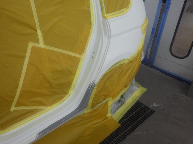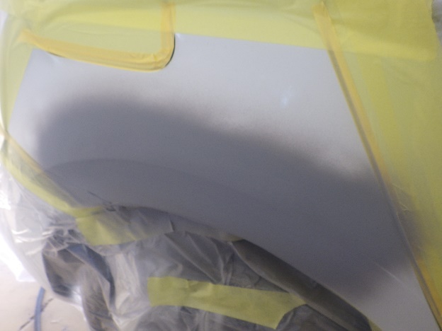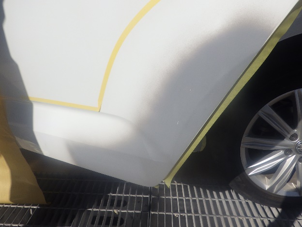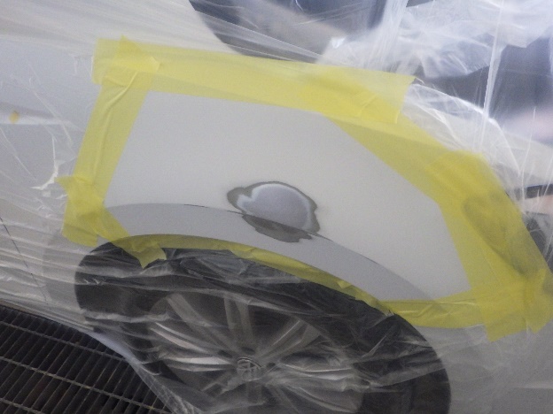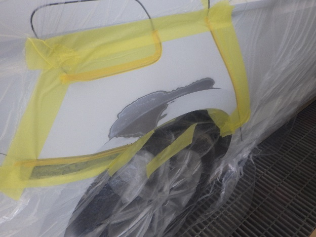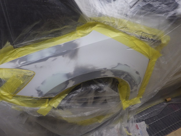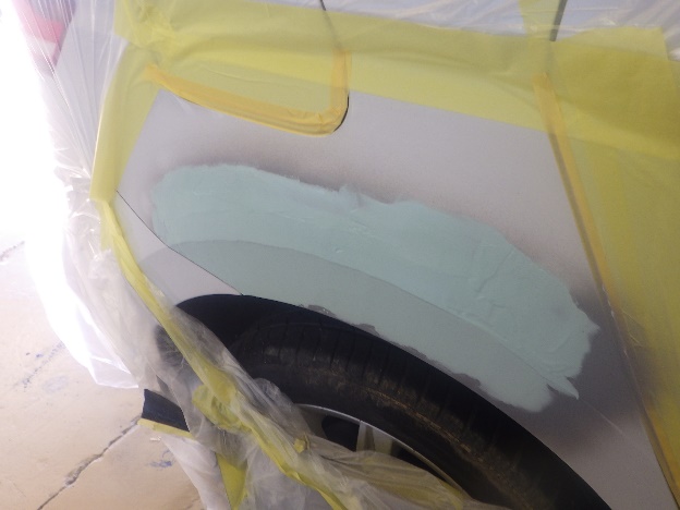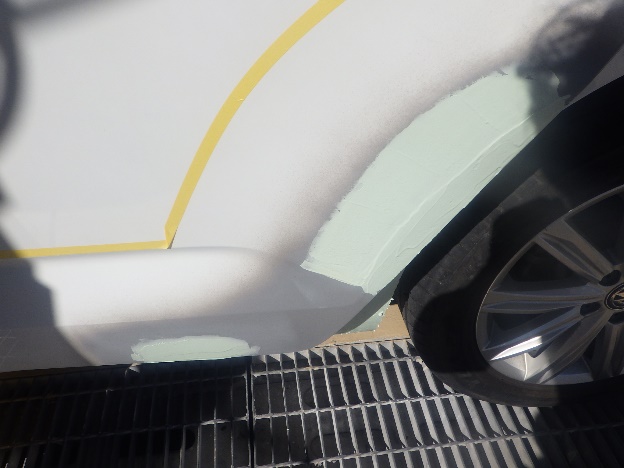 パテ乾燥の後、サンディング作業、マスキング作業、脱脂作業、エアブローを行い、