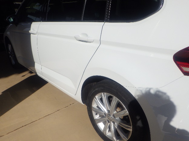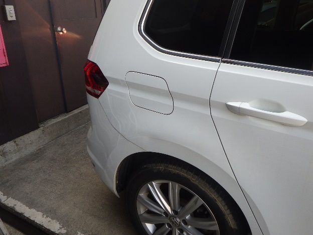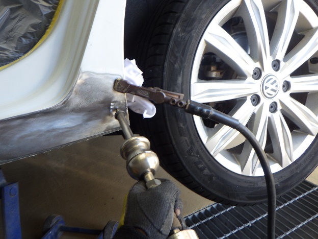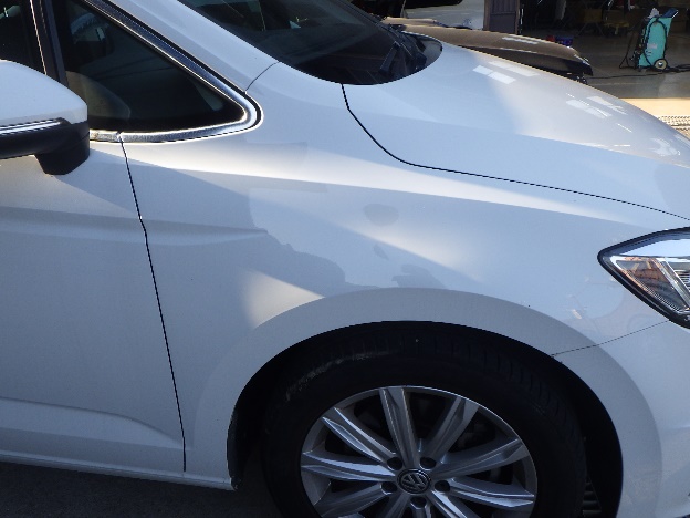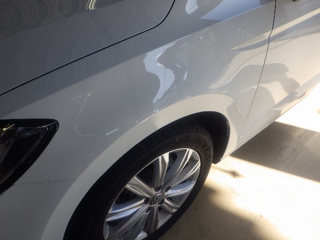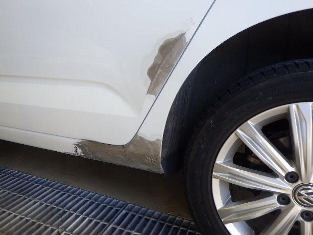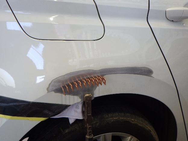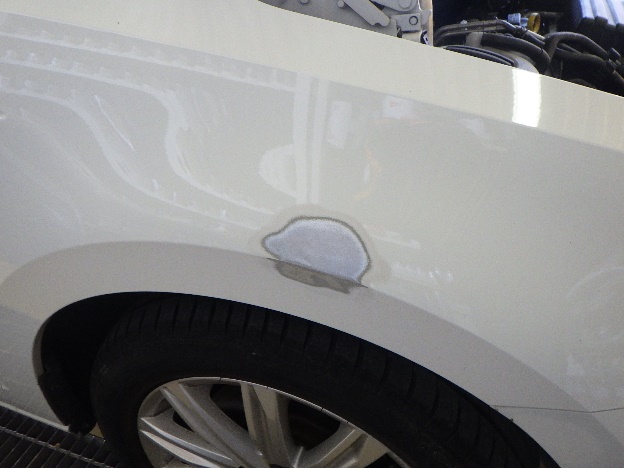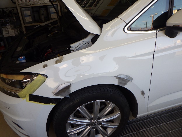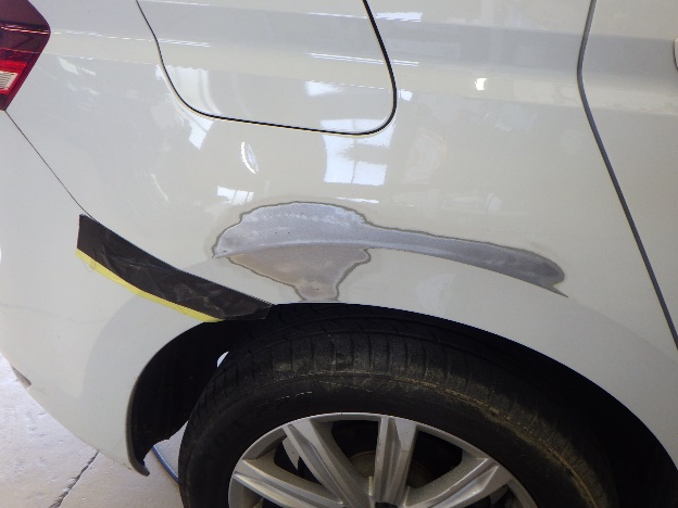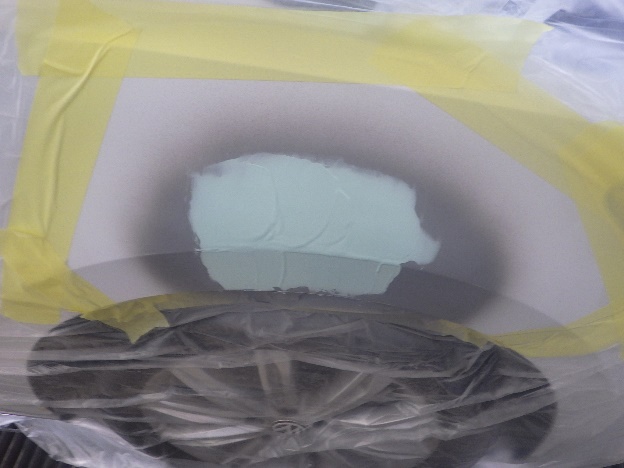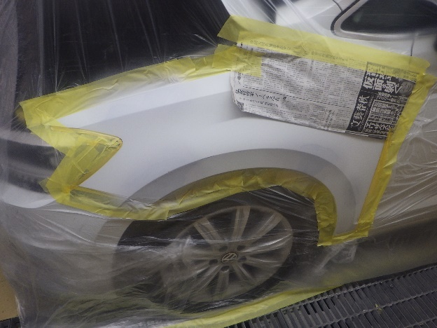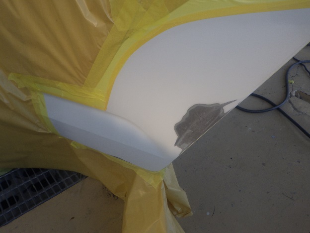 パテ乾燥の後、サンディング作業、マスキング作業、脱脂作業、エアブローを行い、