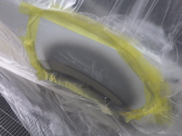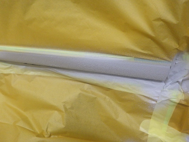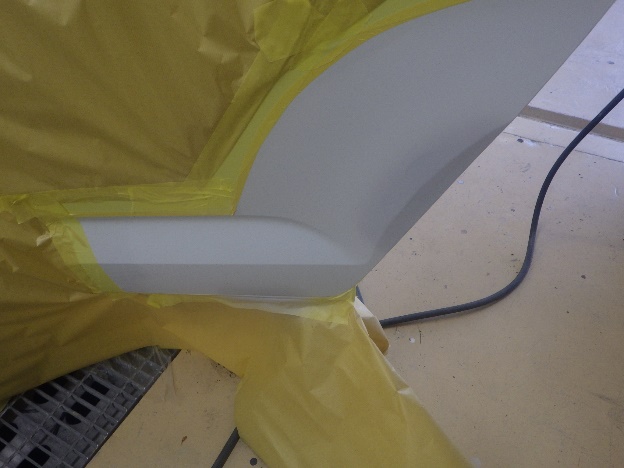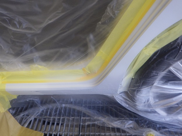 サフェーサー乾燥の後、足付け作業、マスキング作業、脱脂作業、エアブローを行い、