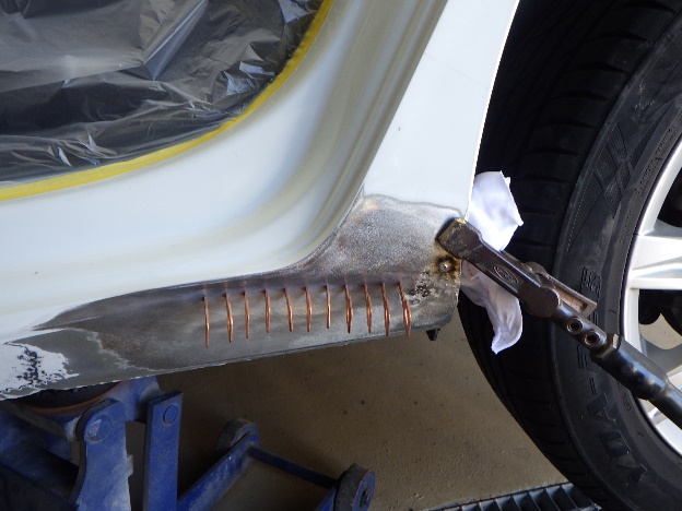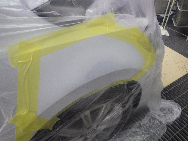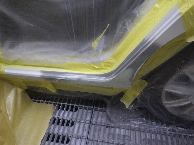 板金作業の後、マスキング作業、脱脂作業、エアブローを行い、