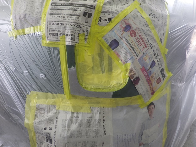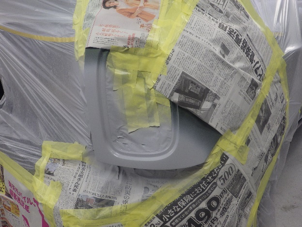 サフェーサー乾燥の後、足付け作業、マスキング作業、脱脂作業、エアブローを行い、