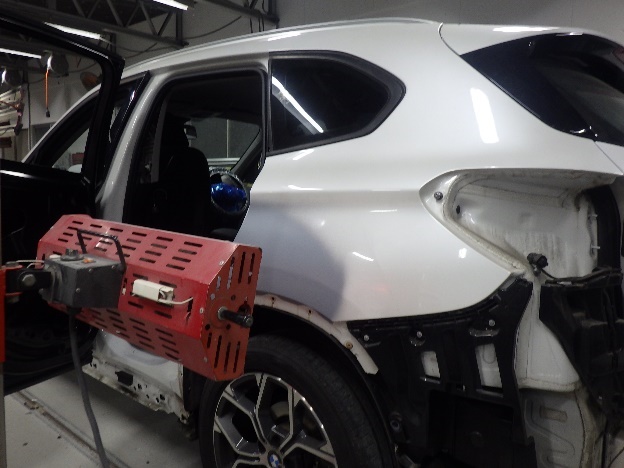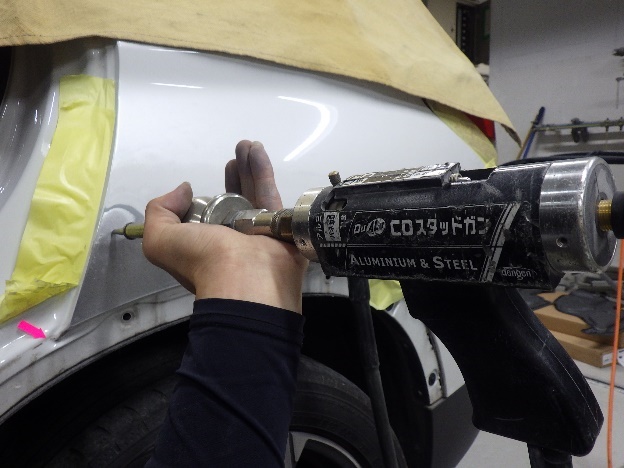 色剥ぎ作業の後、スタッドを使用し、損傷パネルの引き出し作業を行いました。