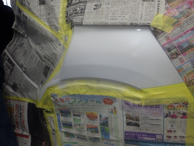 パテ成形作業の後、サフェーサーの塗布準備(足付け、紙貼り、脱脂、エアブロー)を行い、