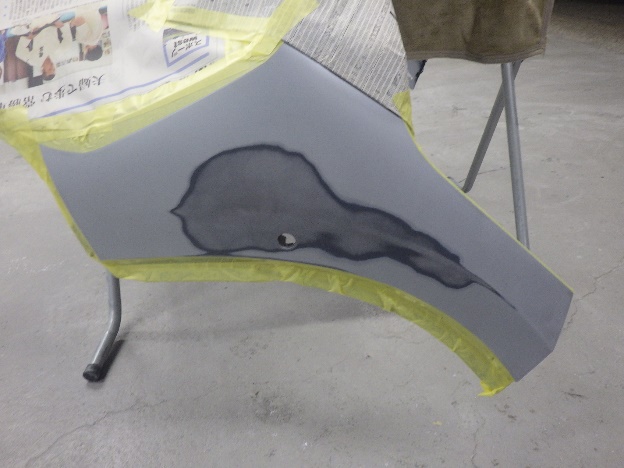 サフェーサー乾燥の後、足付け作業、マスキング作業、脱脂作業、エアブローを行い、