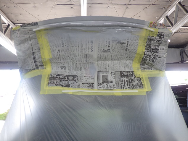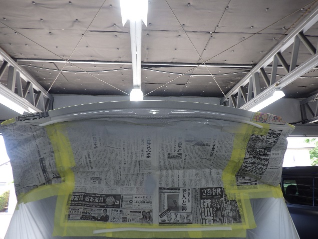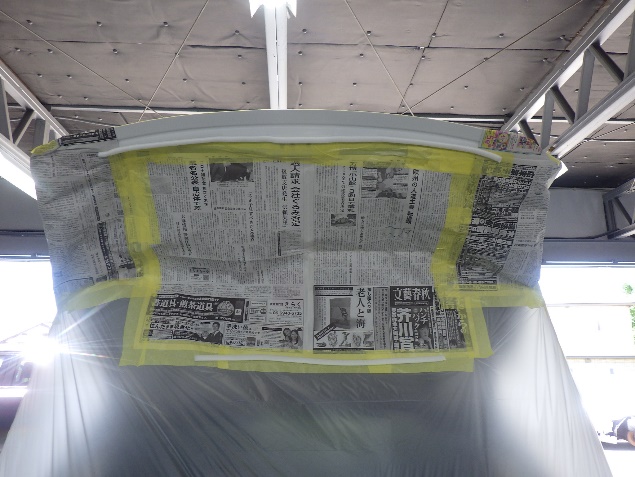 足付け、紙貼り、脱脂、エアブローの後、サフェーサー塗布作業を行いました。