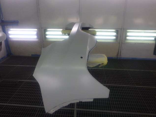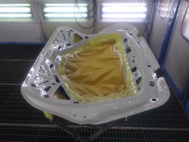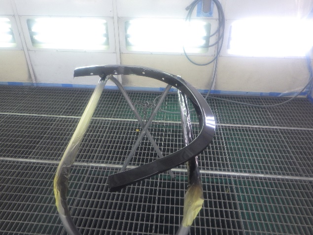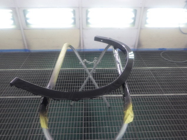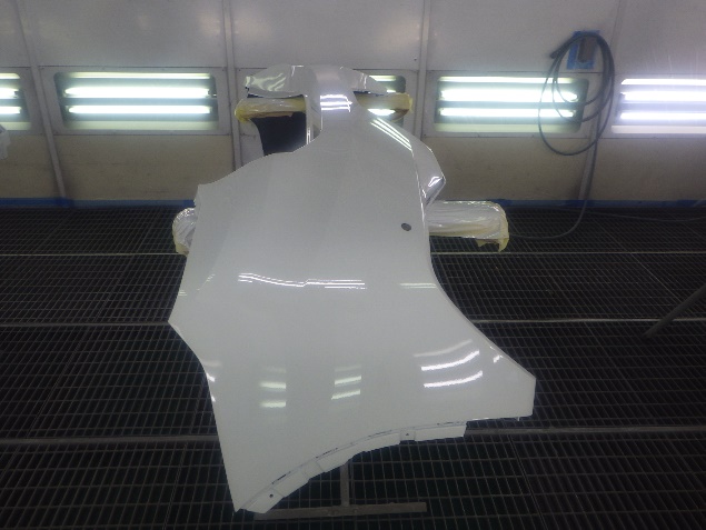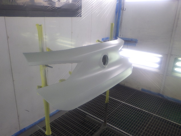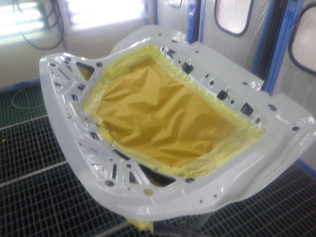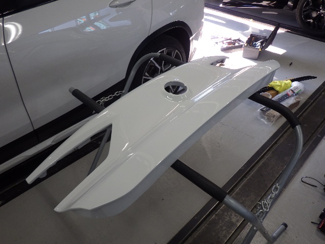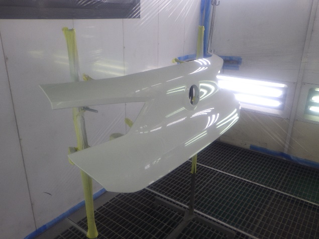 サフェーサー乾燥の後、ベースコート(白)、トップコート(クリヤー)の塗装作業を行いました。