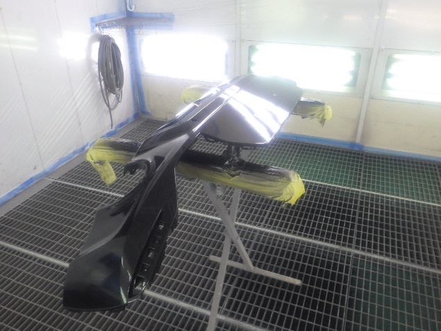 サフェーサー乾燥の後、ベースコート(黒)、トップコート(艶消しクリヤー)の