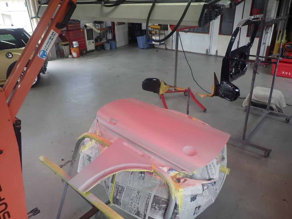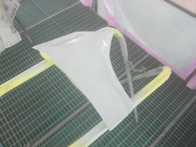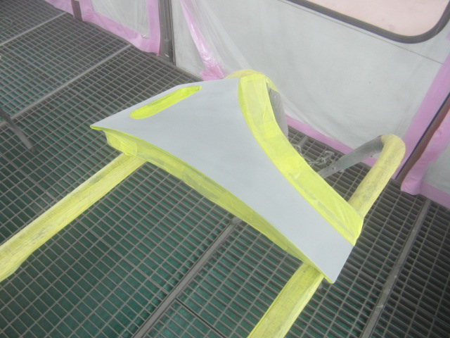 サフェーサー乾燥の後、足付け作業、マスキング作業、脱脂作業、エアブローを行い、