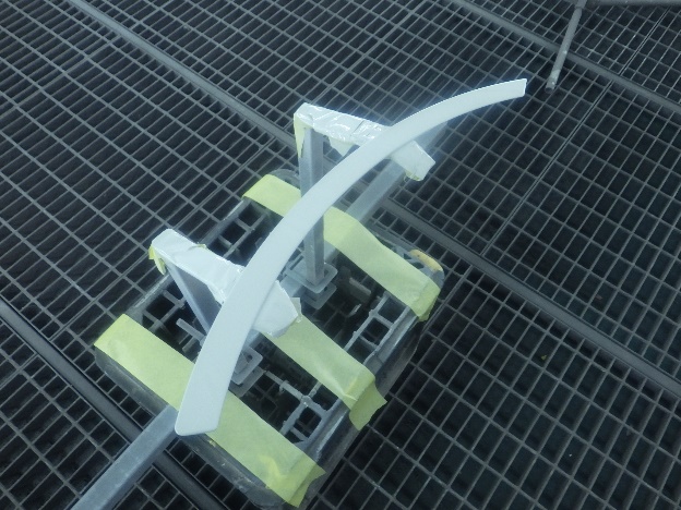 成形作業の後、サフェーサーの塗布準備(足付け、紙貼り、脱脂、エアブロー)を行い、