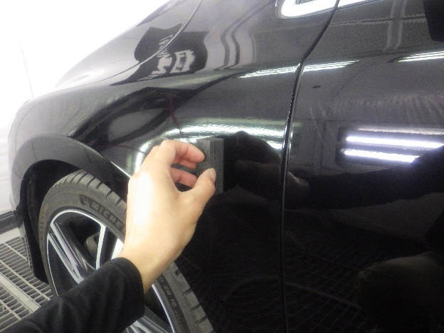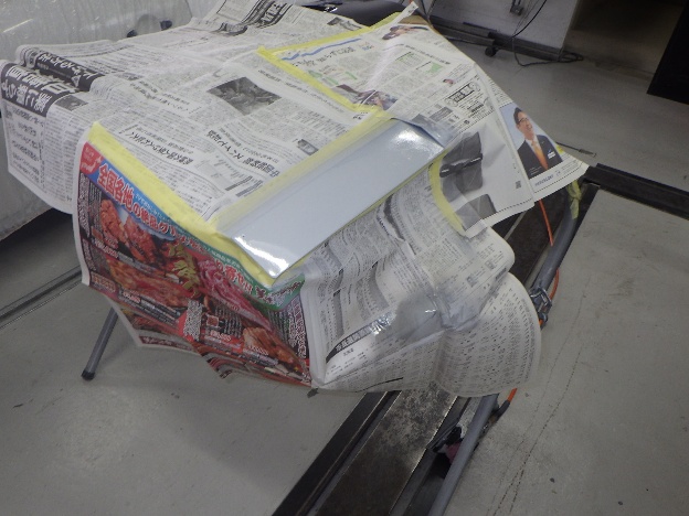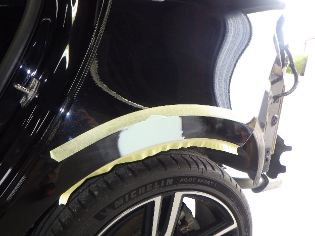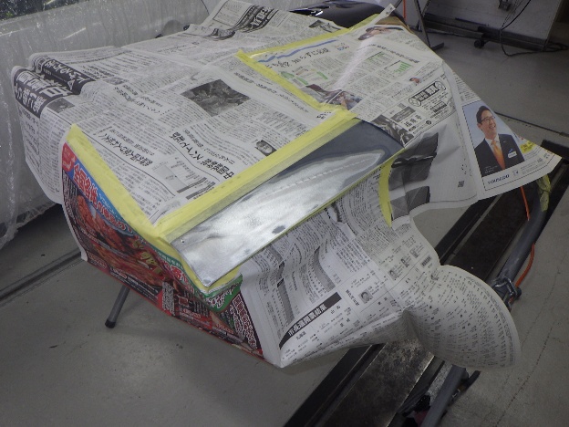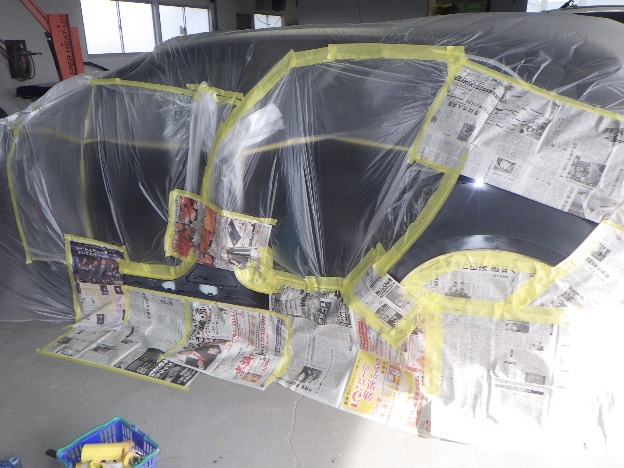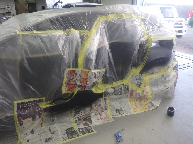 パテ乾燥の後、サンディング作業、マスキング作業、脱脂作業、エアブローを行い、