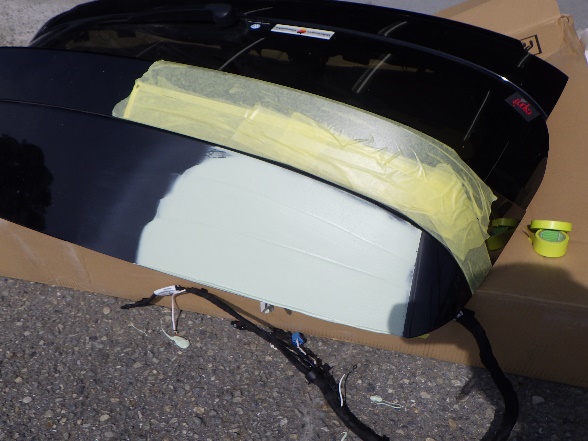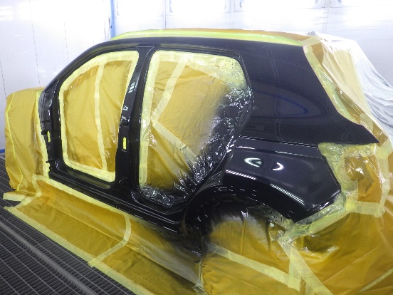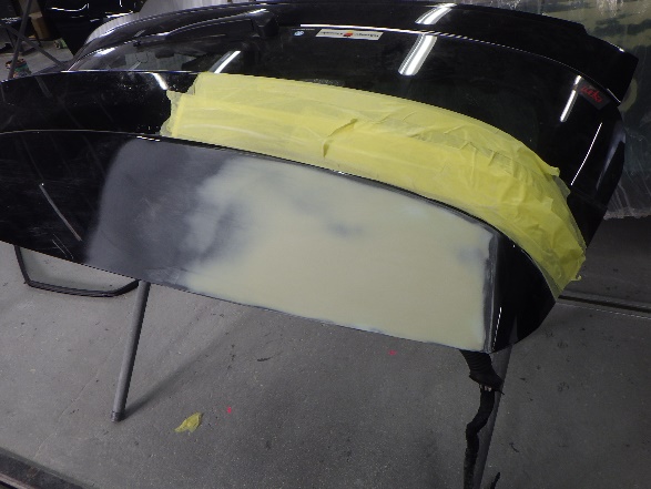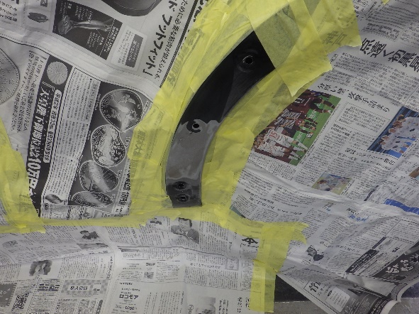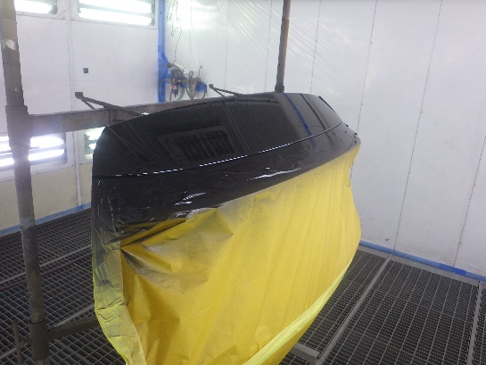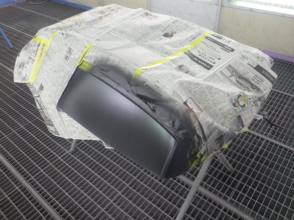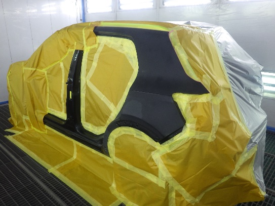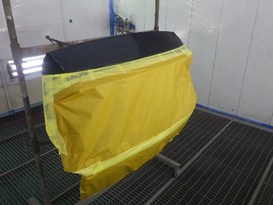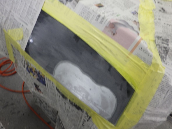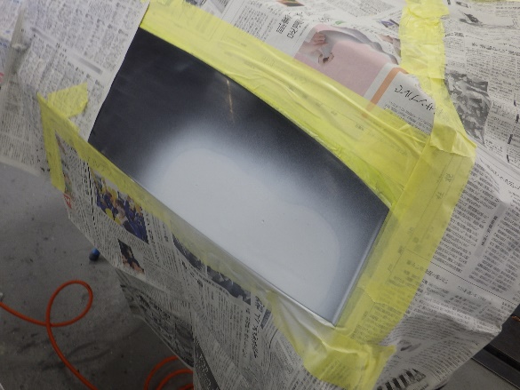 サフェーサー水研ぎ作業の後、塗装ブース内に入れ、マスキング作業シリコンオフで脱脂、