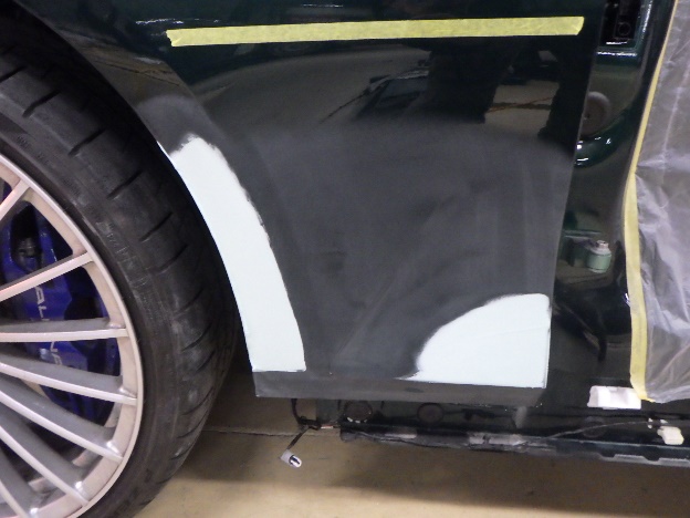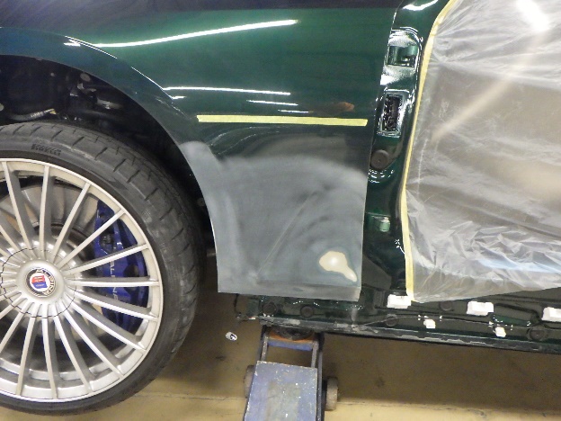 キズ修正作業の後、フロントフェンダーのパテ成形作業を進めて行きました。