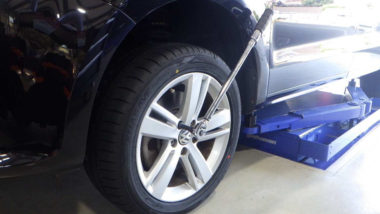 右フロント廻り損傷でのお預かりになります。 まず初めに、ホイールへの損傷があったので、足廻りの計測作業を行いました。 足廻りの計測を行ない、数値に問題が無い事を…