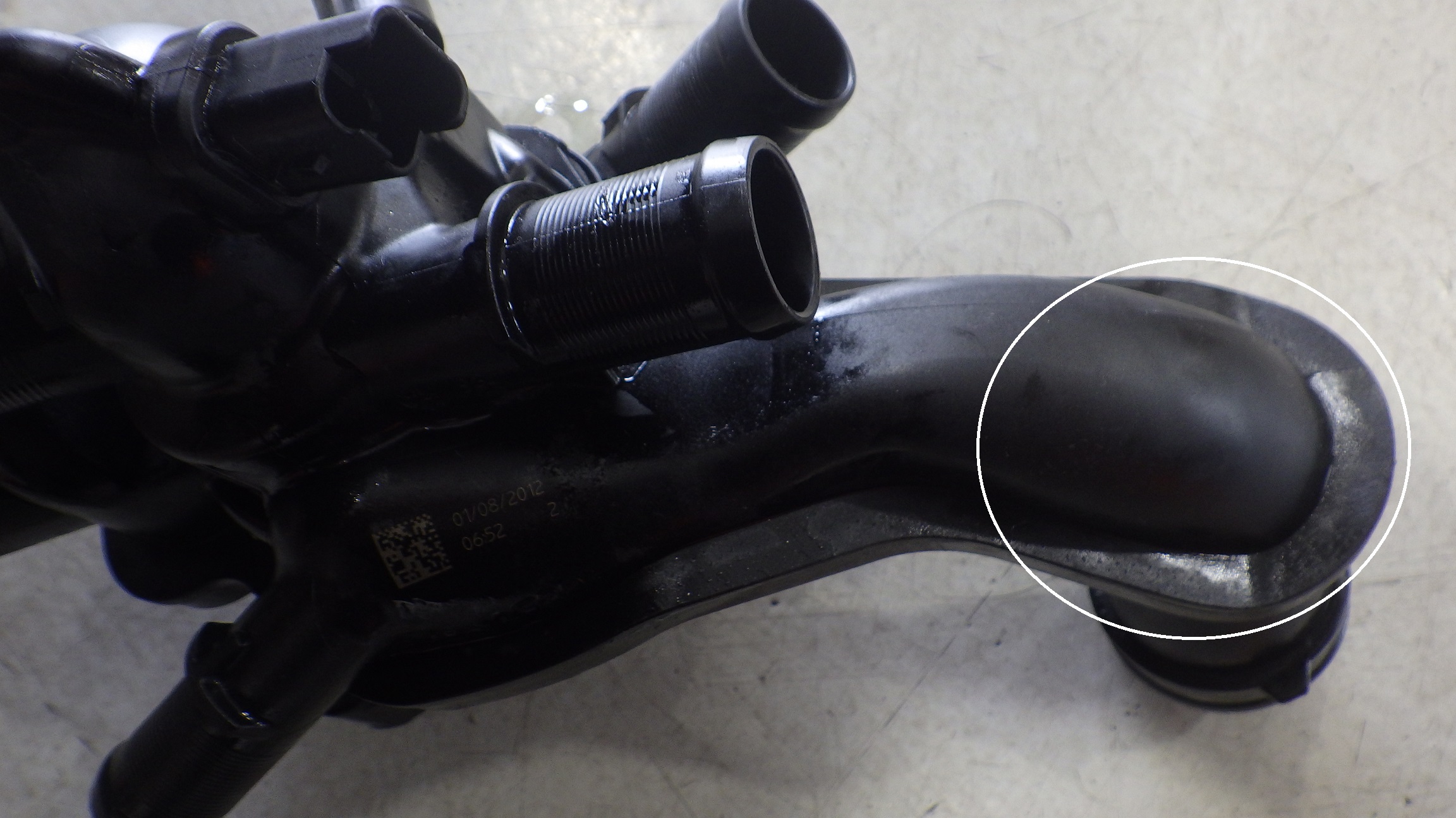 サーモスタットケースの丸印付近からの漏れが確認できました。