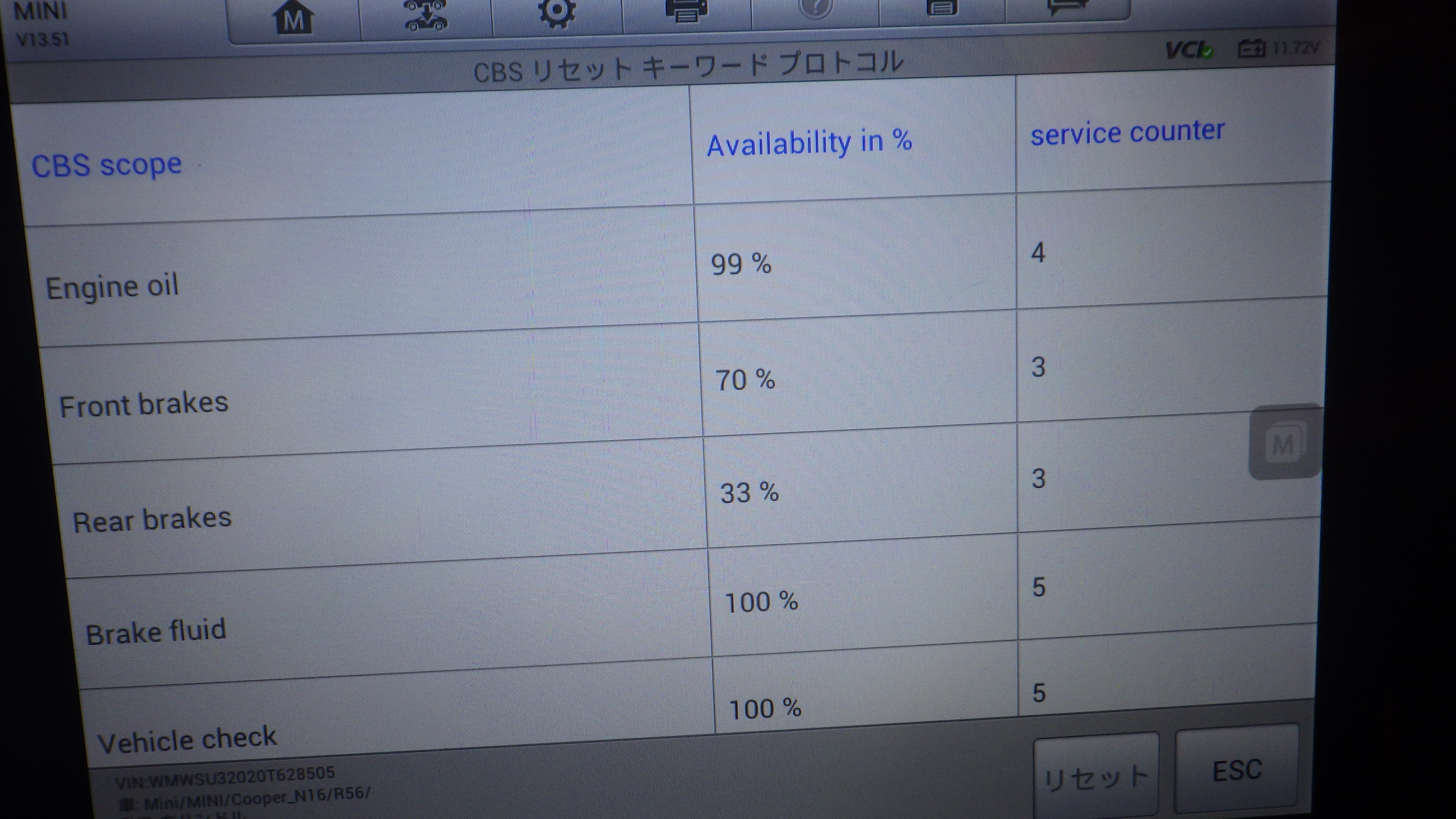 テスターにて故障コードの確認と、サービスのリセットを実施しています。