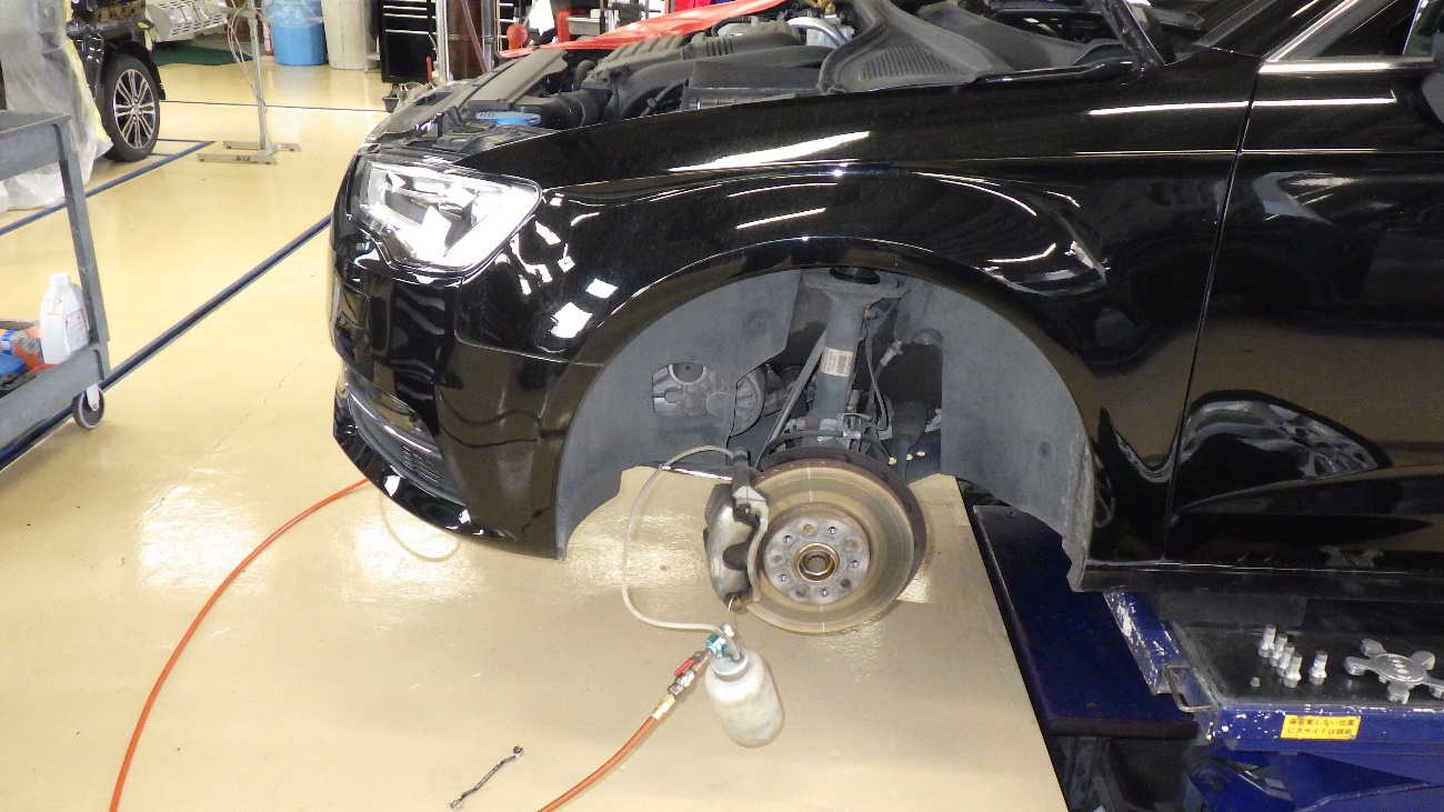 フロント部のブレーキオイルの交換作業様子になります。