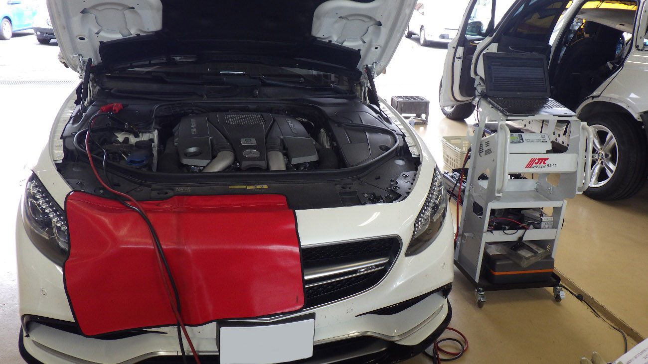 バッテリーチャージャーを繋いで、電圧を安定化して診断させていただきます。