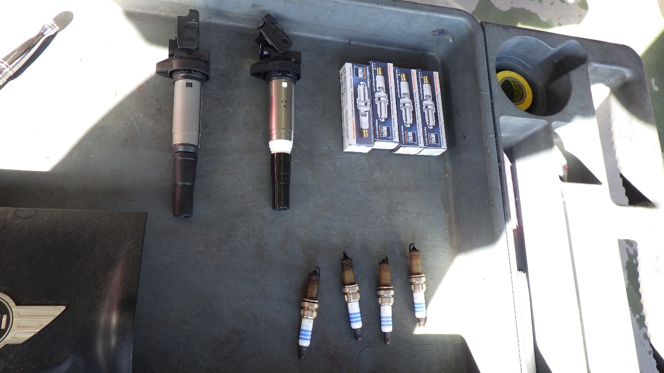 取り外した部品と今回交換させていただく、イグニッションコイルとスパークプラグになります。